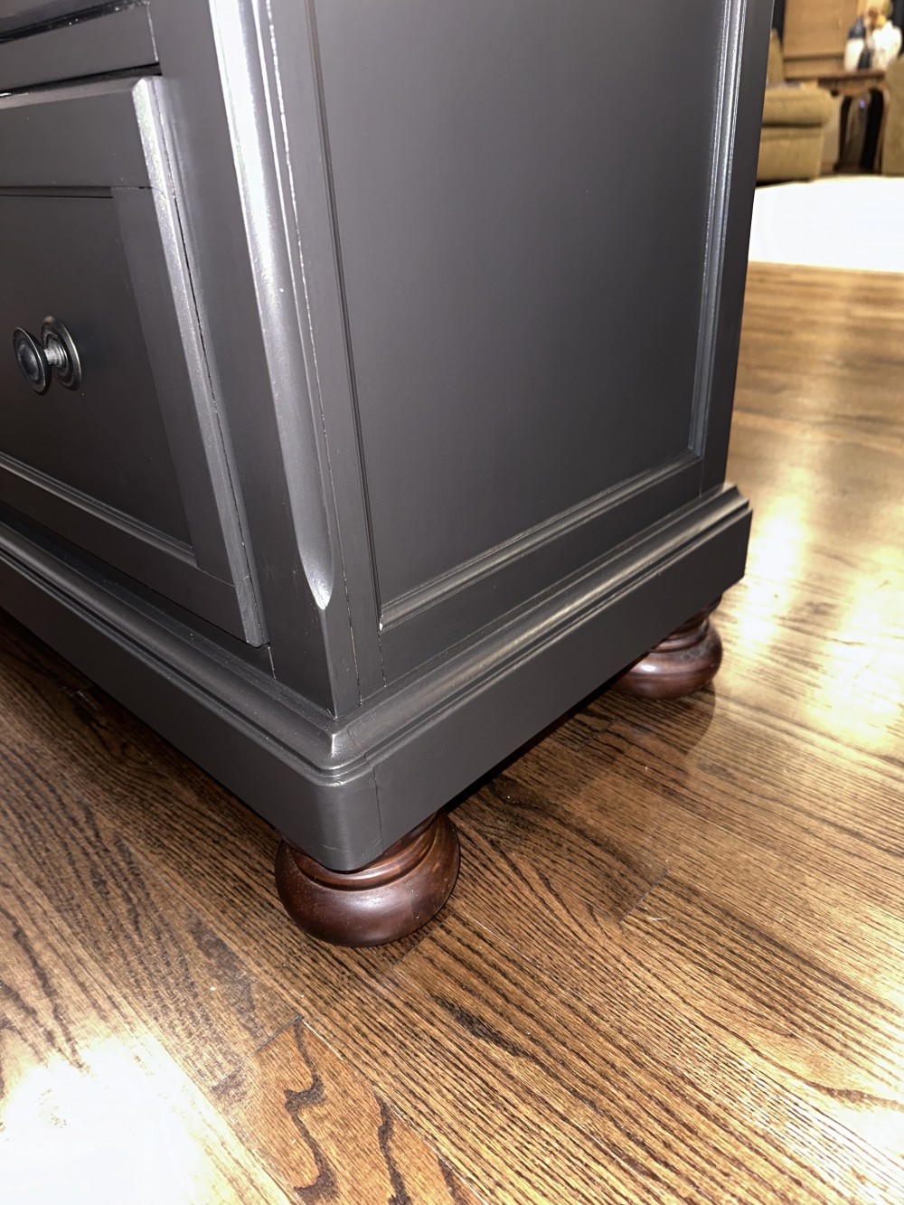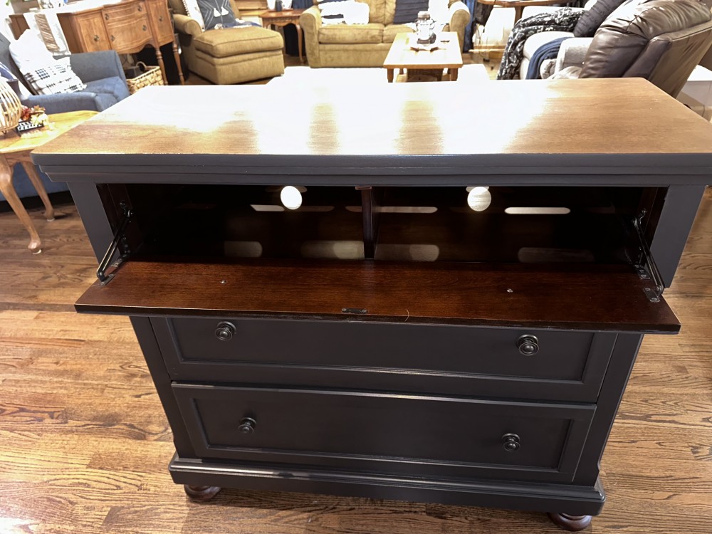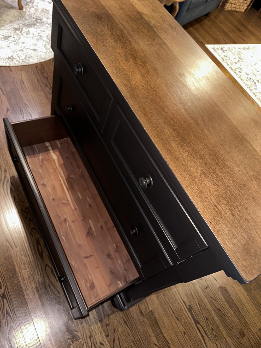 This piece was called a media cabinet by the manufacturer, but as we were refinishing it we thought of other possibilities in addition to an entertainment center. It could also be used as a dresser or sideboard depending on your need. The top portion pulls down and can be used as a charging station or to hold smaller items in baskets or bins. The two drawers are both deep and wide to store many things. We sanded down the top to its natural wood and then stained it dark walnut. The sides were painted black, and we added a matte topcoat to the sides and top for extra protection and durability.