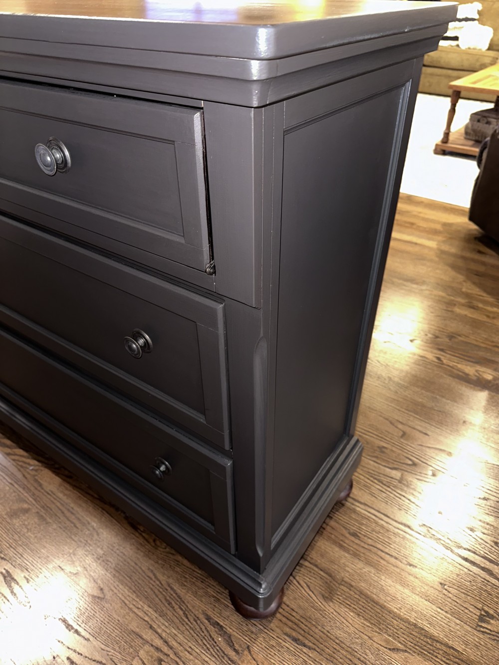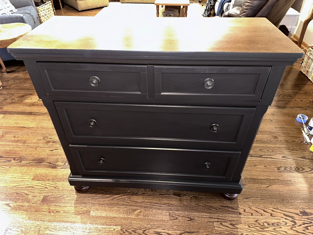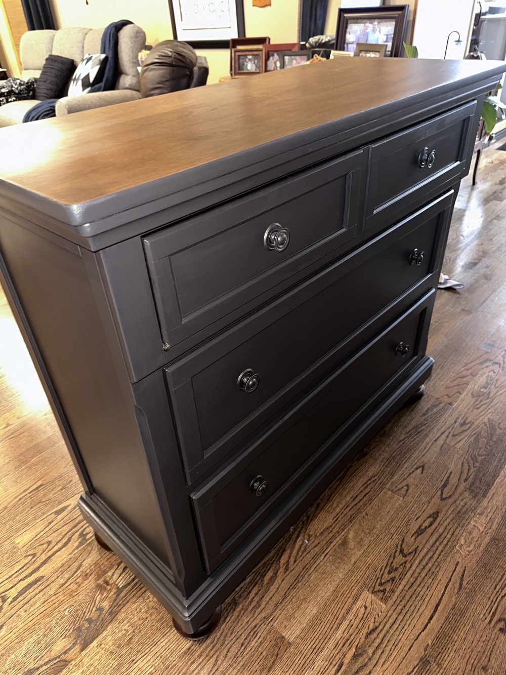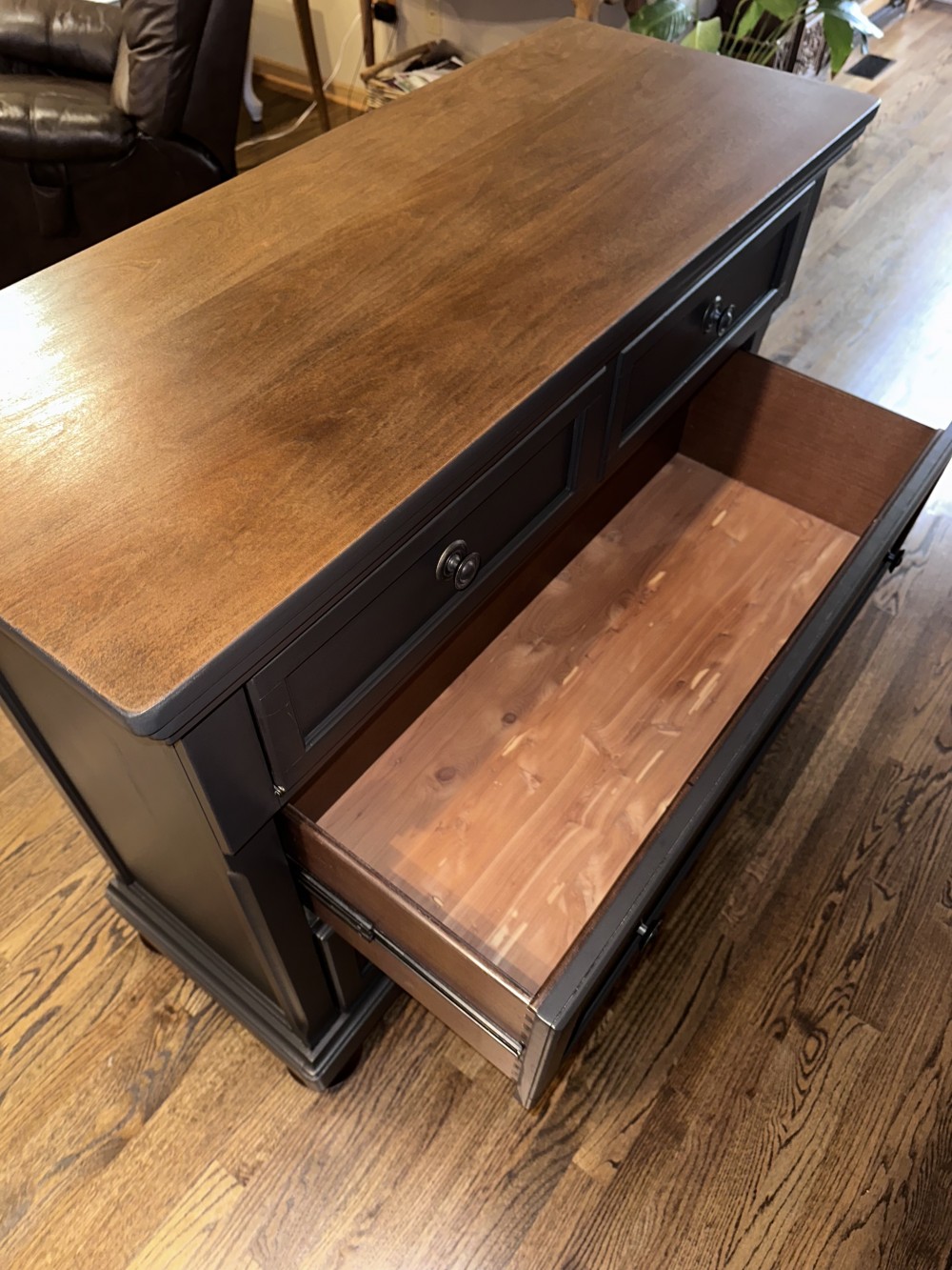 This piece was called a media cabinet by the manufacturer, but as we were refinishing it we thought of other possibilities in addition to an entertainment center. It could also be used as a dresser or sideboard depending on your need. The top portion pulls down and can be used as a charging station or to hold smaller items in baskets or bins. The two drawers are both deep and wide to store many things. We sanded down the top to its natural wood and then stained it dark walnut. The sides were painted black, and we added a matte topcoat to the sides and top for extra protection and durability.