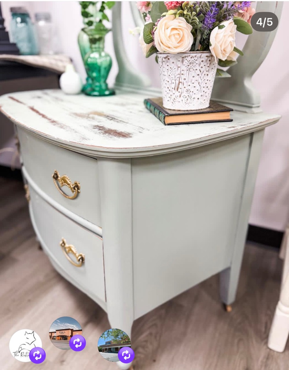 Beautiful green vanity that would be beautiful in hallway, bathroom, or bedroom. Great storage with great bones.