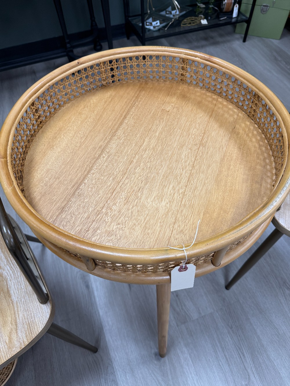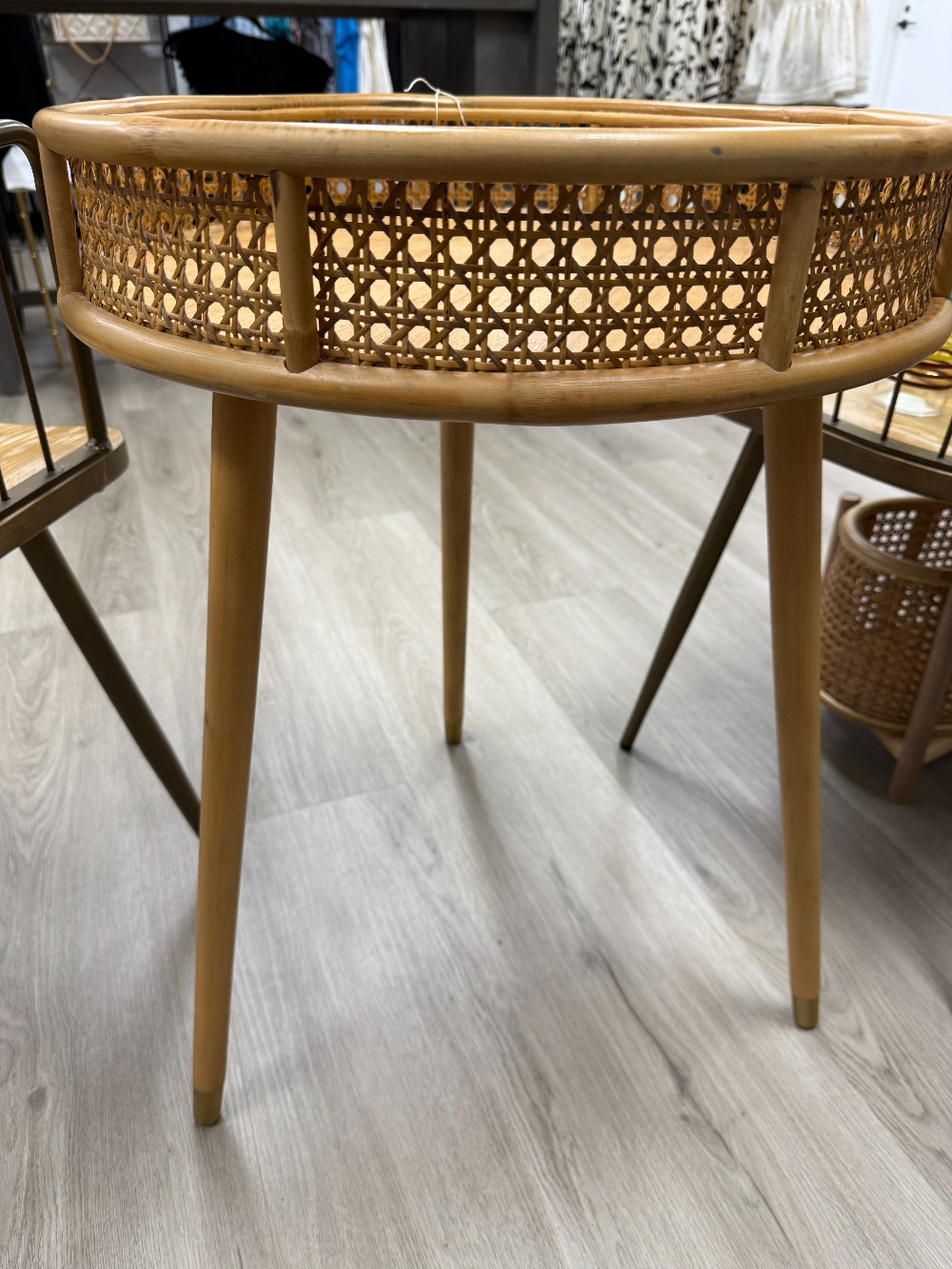 Unique cane webbing and wood tray with wood three tapered legs. Great as a drinks tray, plant stand, or accent table.