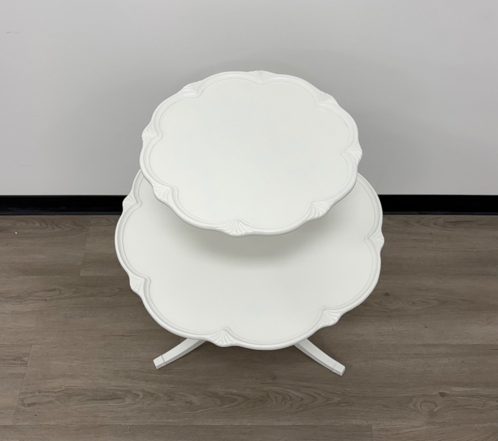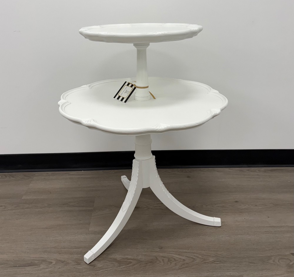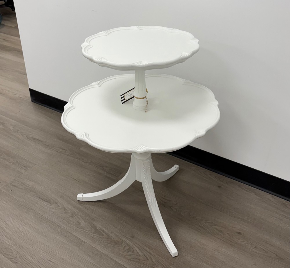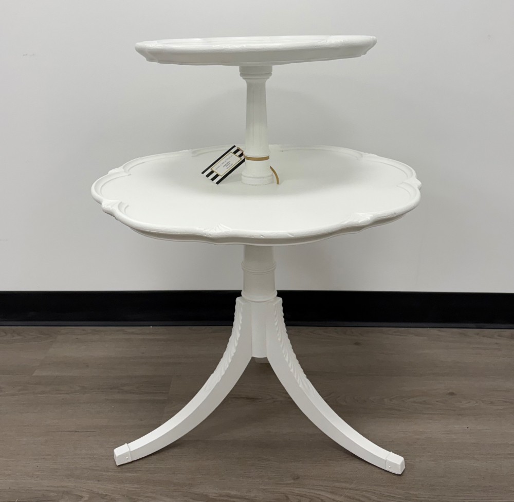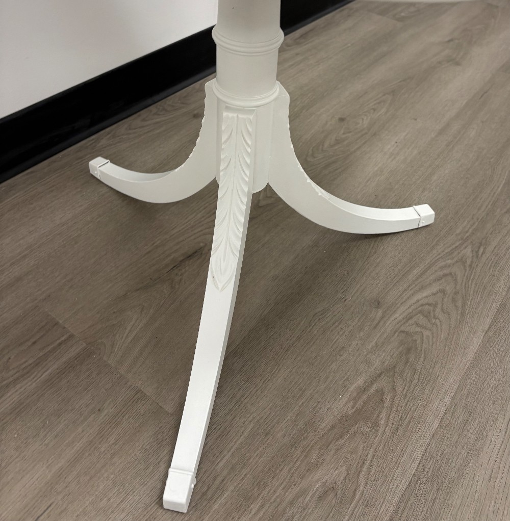 This table is so sweet. It’s finished with Benjamin Moore Advance in White. Measures 31x24.