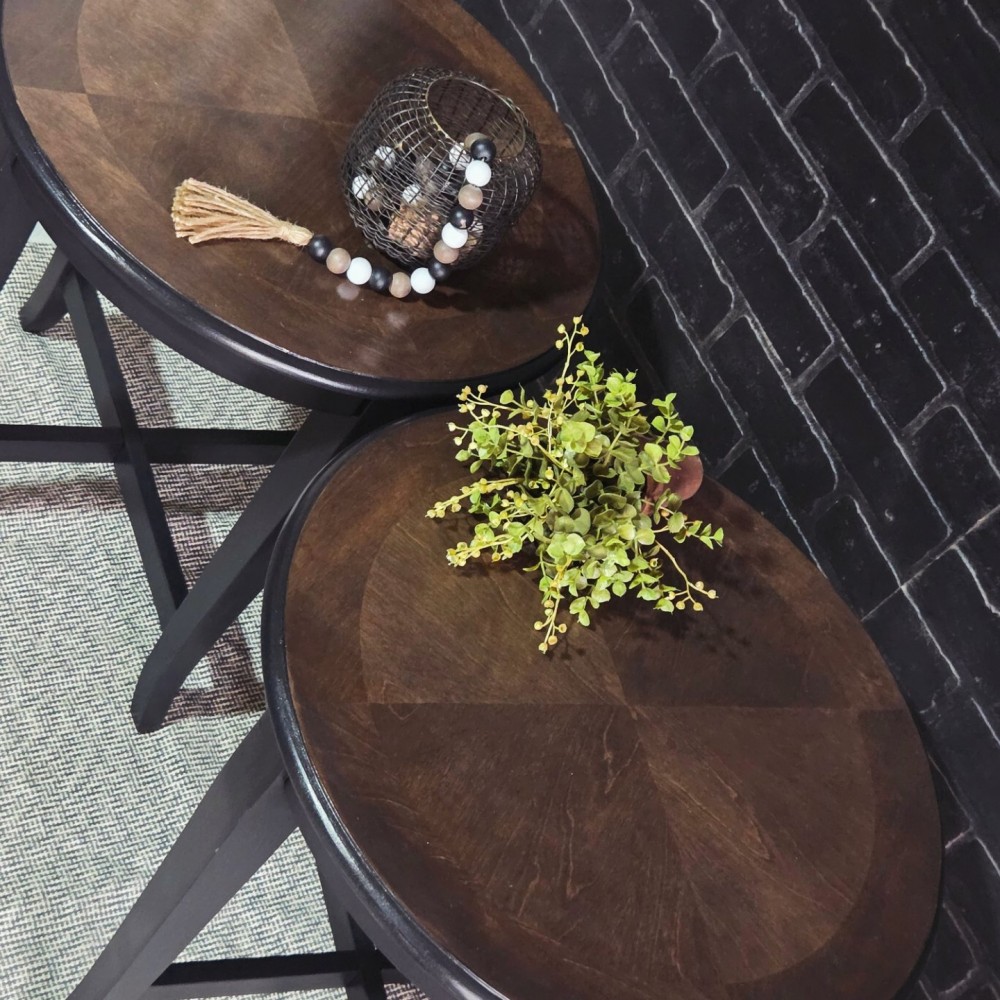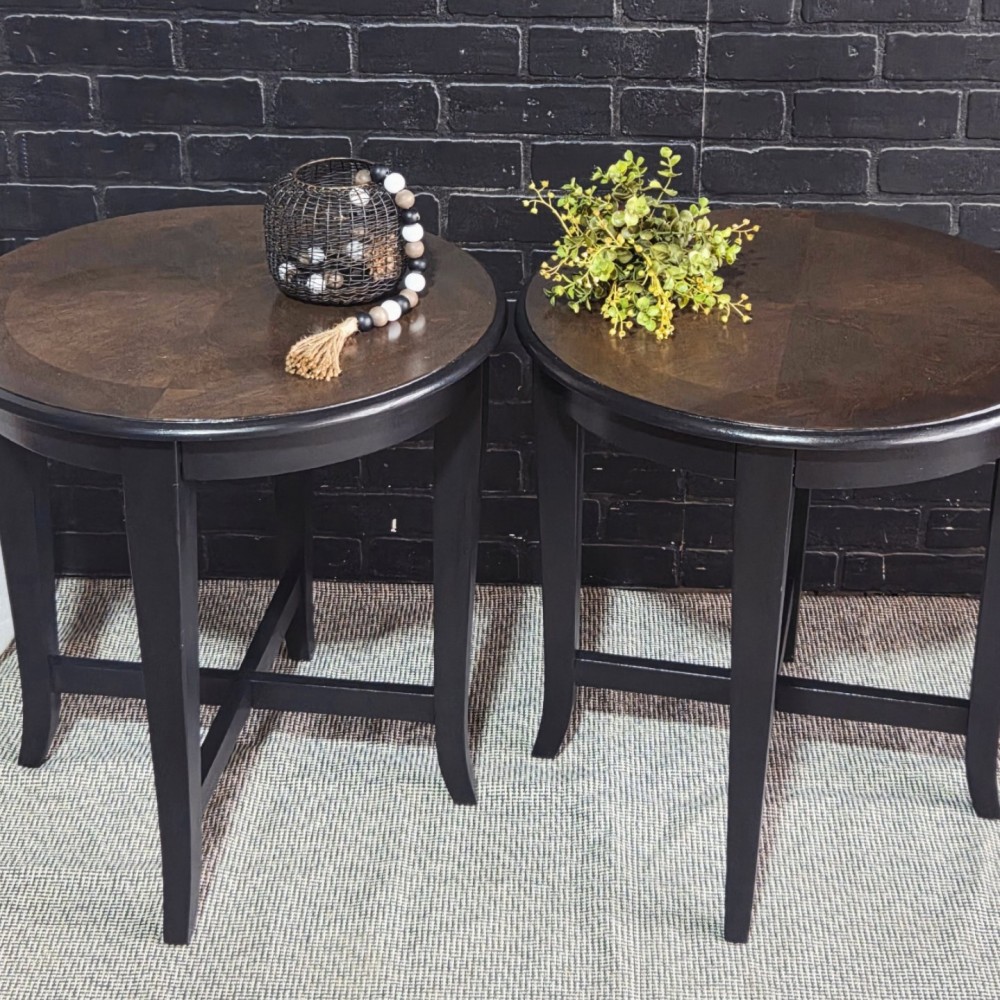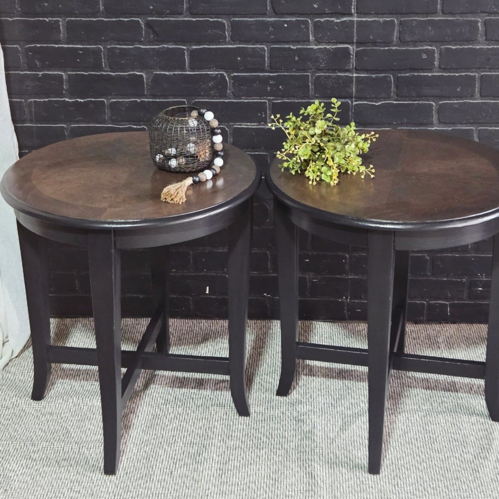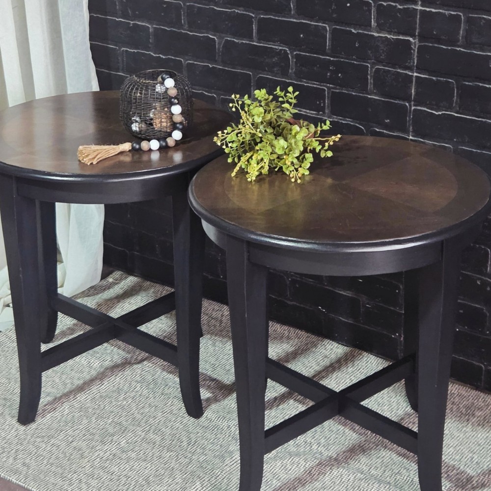 Tops sanded and stained in kona stain. Sealed in gloss poly for durability and protection. Rest painted in lillymoonpaint opulent black lace.