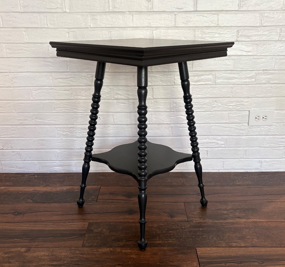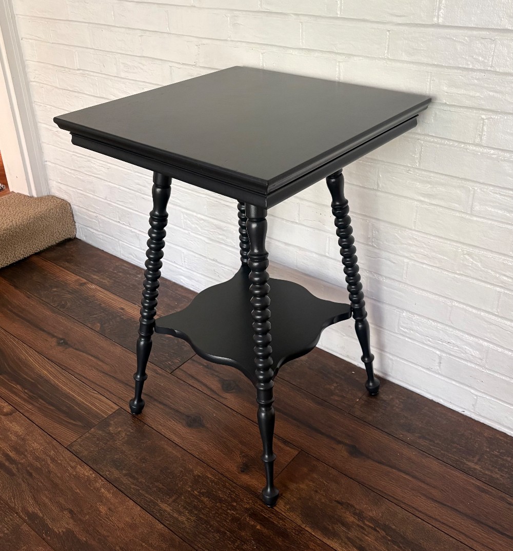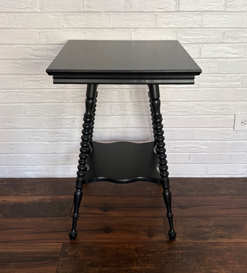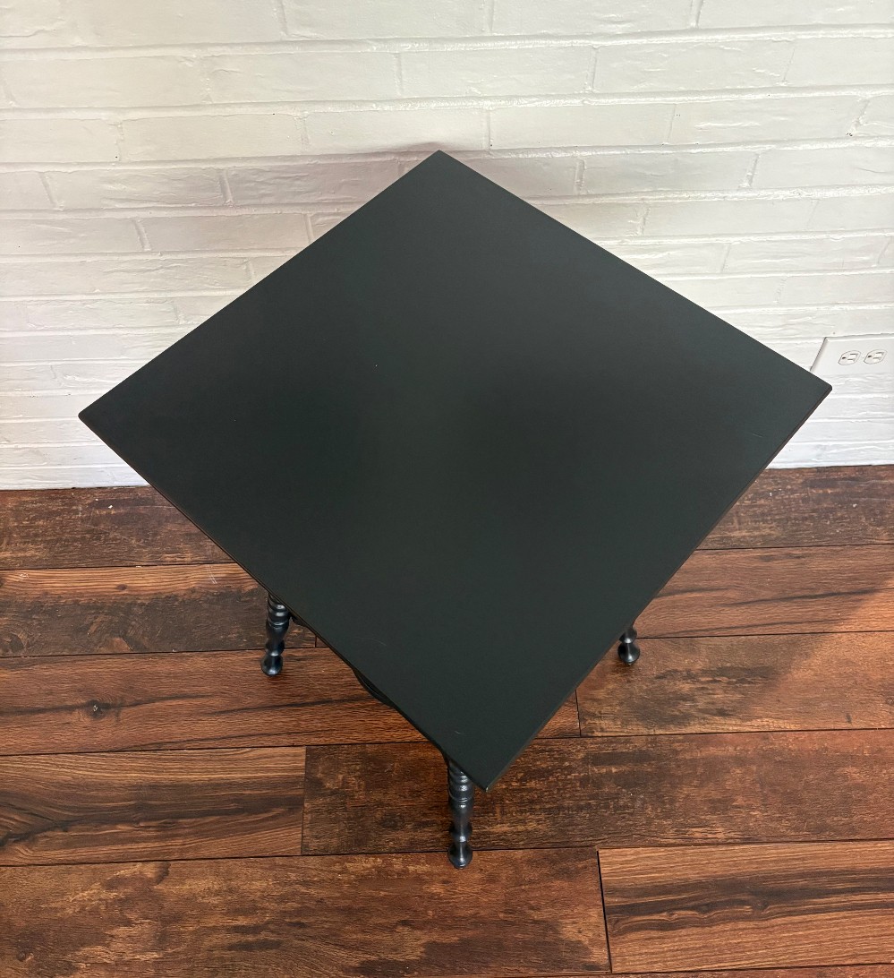 Super Unique, Black Bobbin leg table. Excellent condition. 20x20x29 tall