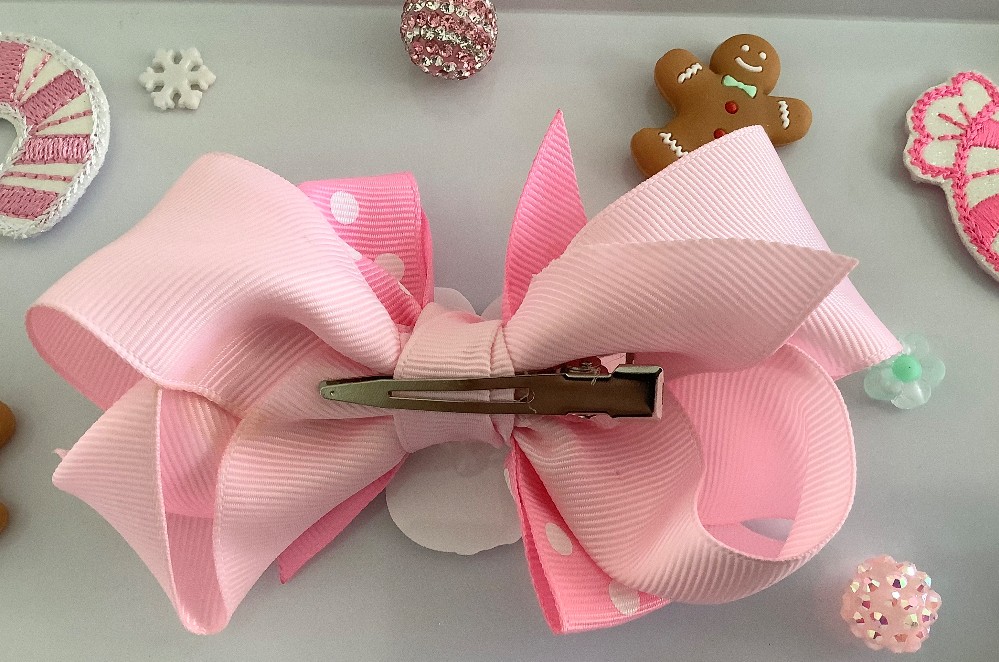 Smaller version of our large Gingerbread Girl bow. Stacked bow is Apx. 4.5” made on a pinch clip.