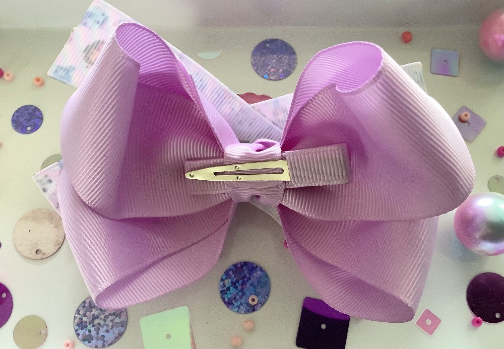 3 layer bow in shades of pink, lilac, and blue. Bow is handmade on a French clip. Bow measures Apx. 4.5”