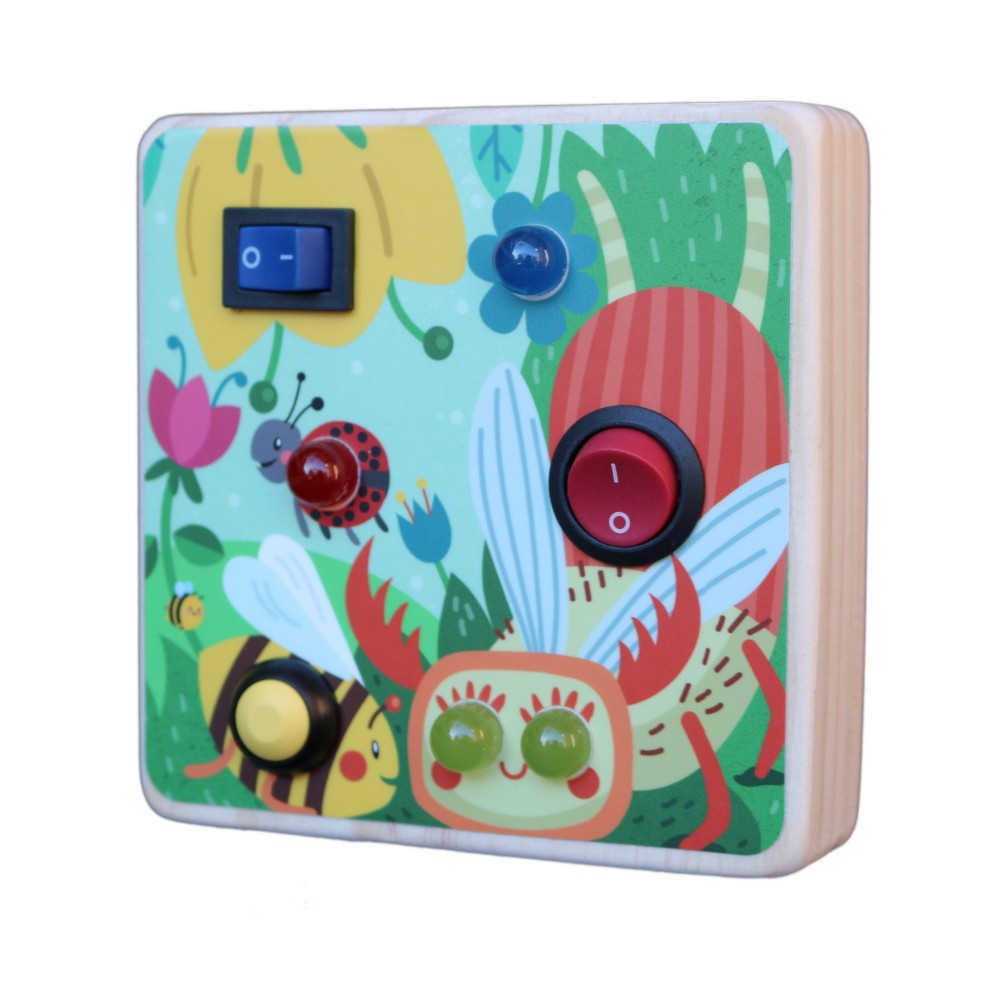 Keep your toddler occupied at home or on the go with this premium, hand made busy board! Three colored, highly tactile buttons will turn on matching LEDs and make a pleasant beep, creating an engaging experience for the little one in your family. Great for developing fine motor skills and learning colors!