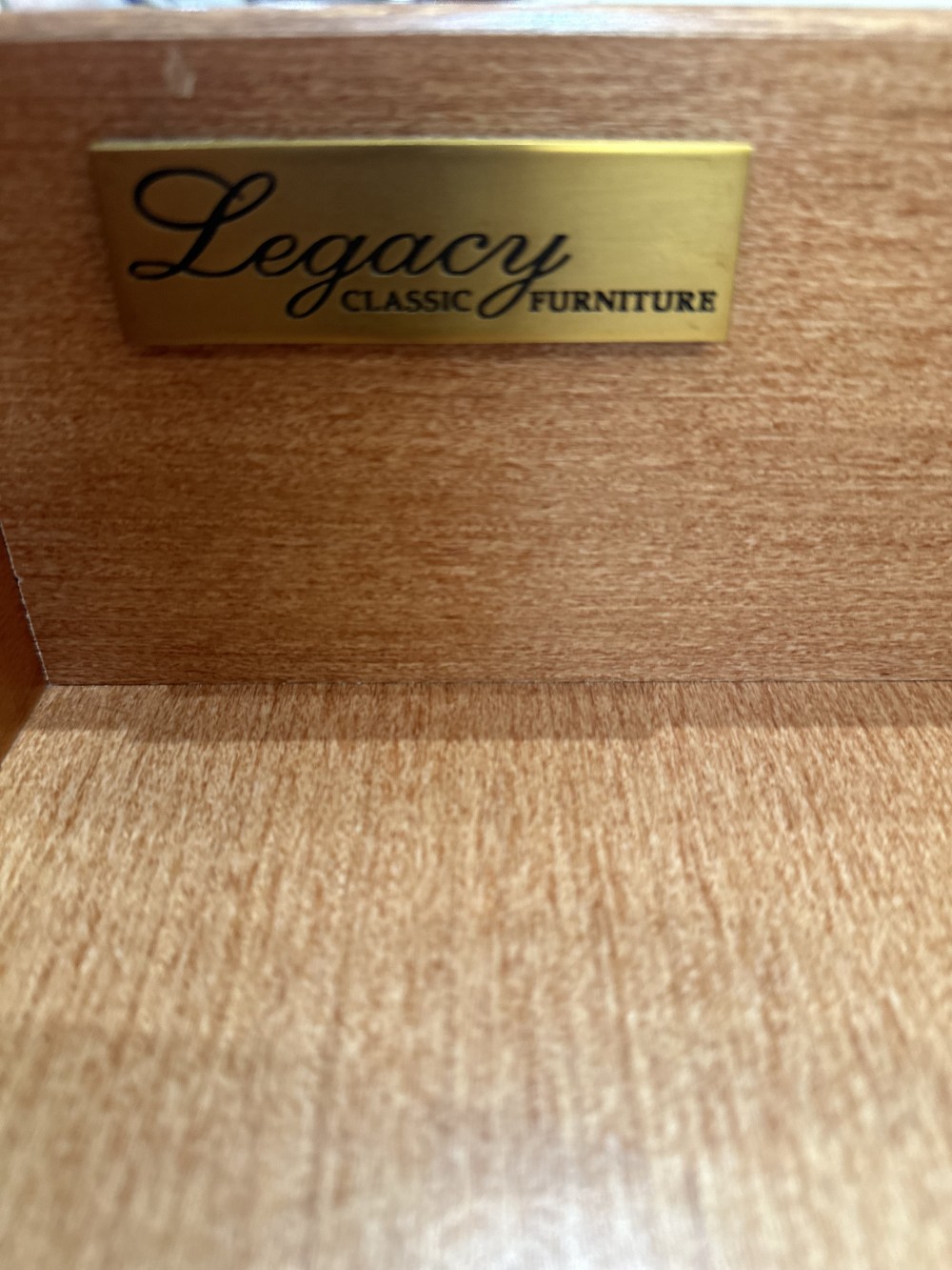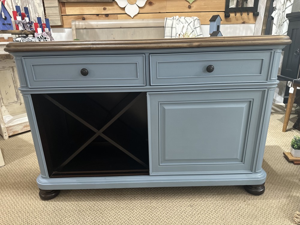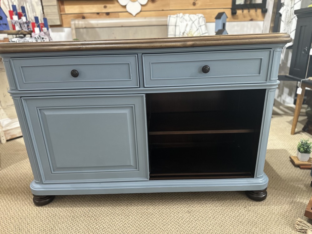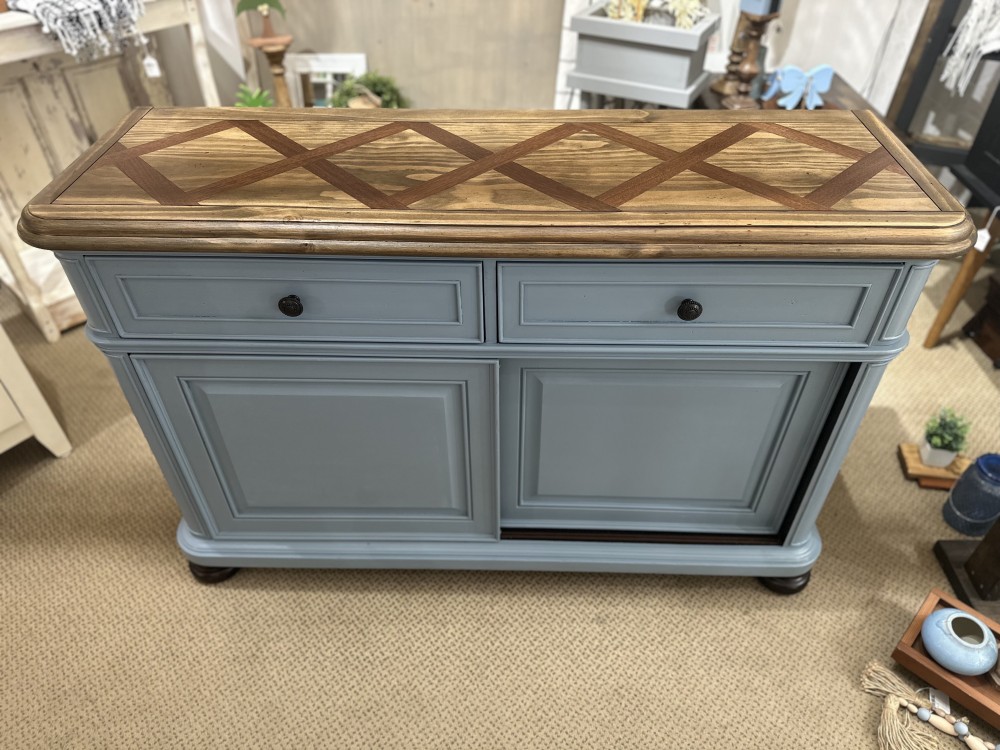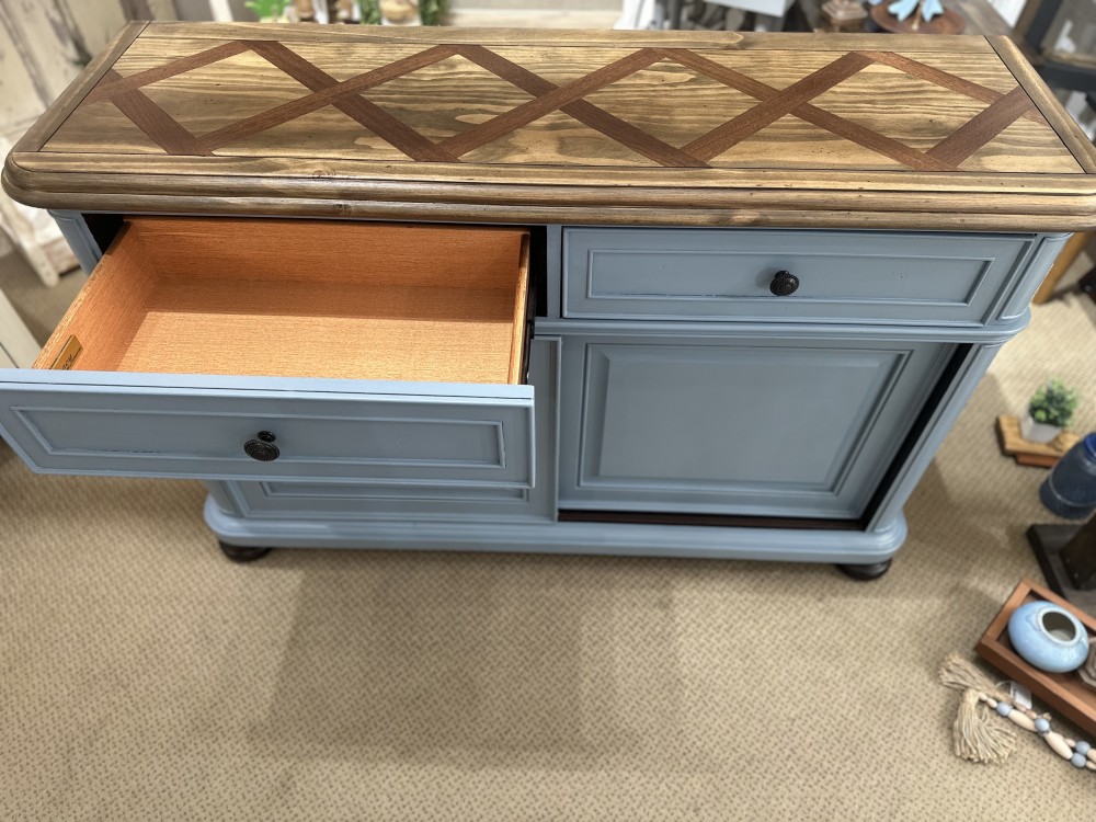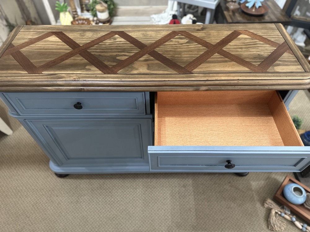 This piece can be used as a sideboard, buffet, entertainment center, and more! We sanded the top down to reveal the beautiful inlaid wood and then stained it in dark walnut. The base was refinished in the color cornflower blue and all surfaces were topped with polyurethane to protect the finishes. There are two drawers to store items, and sliding doors that can hide or expose the rich dark wood and items behind them.