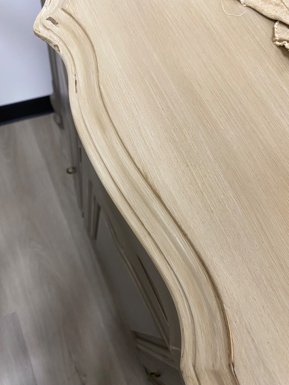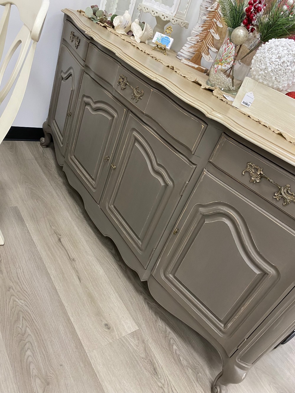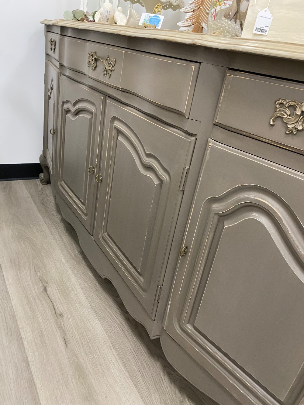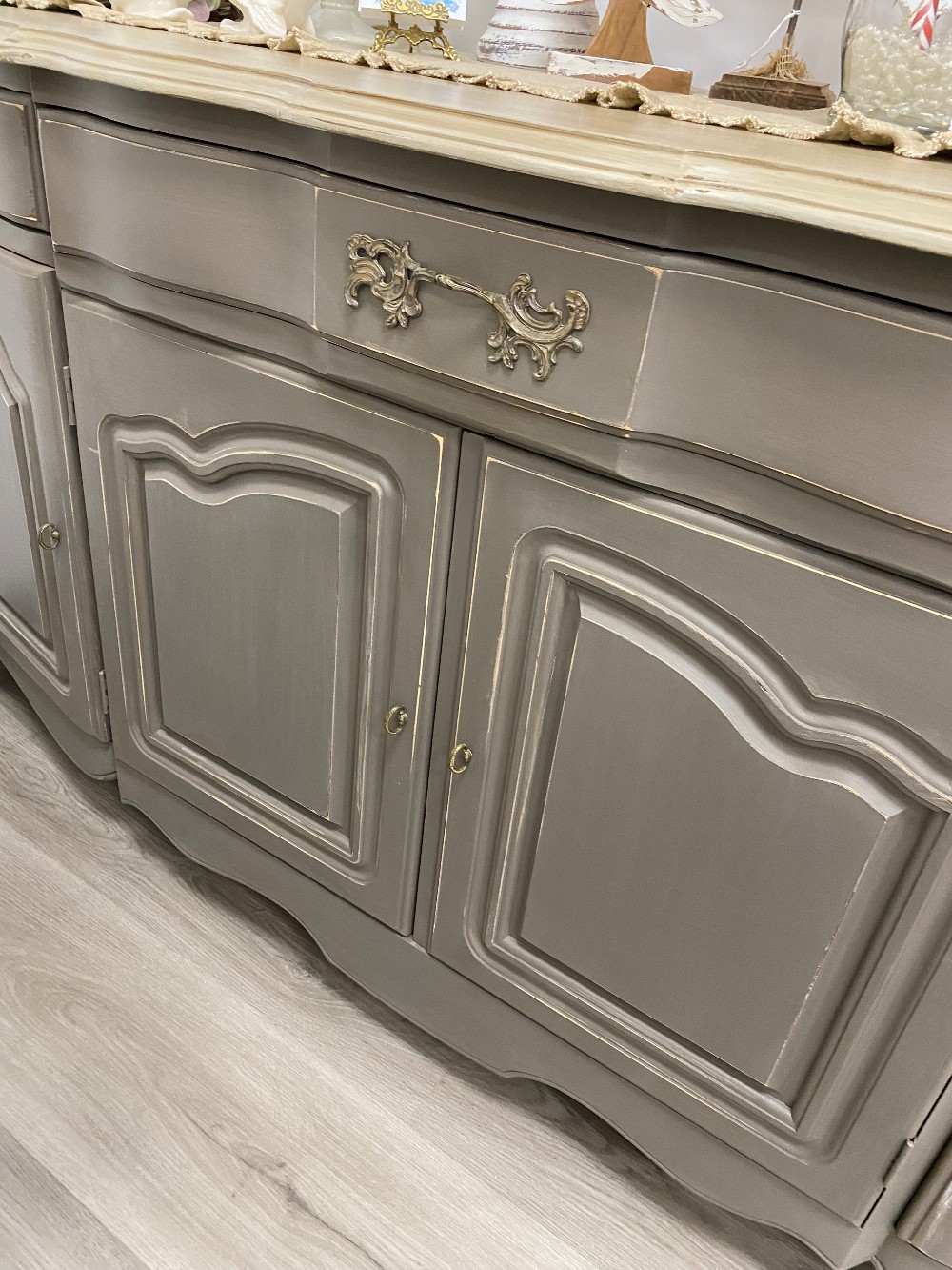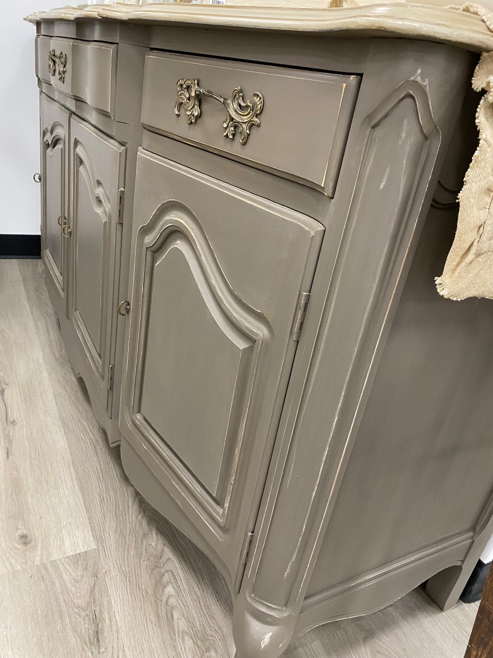 Vintage buffet, newly painted in a warm light brown. Top us layers of paint and glaze, top coated for protection. Slightly distressed. Top drawers are dovetailed and lined in a pretty paper.