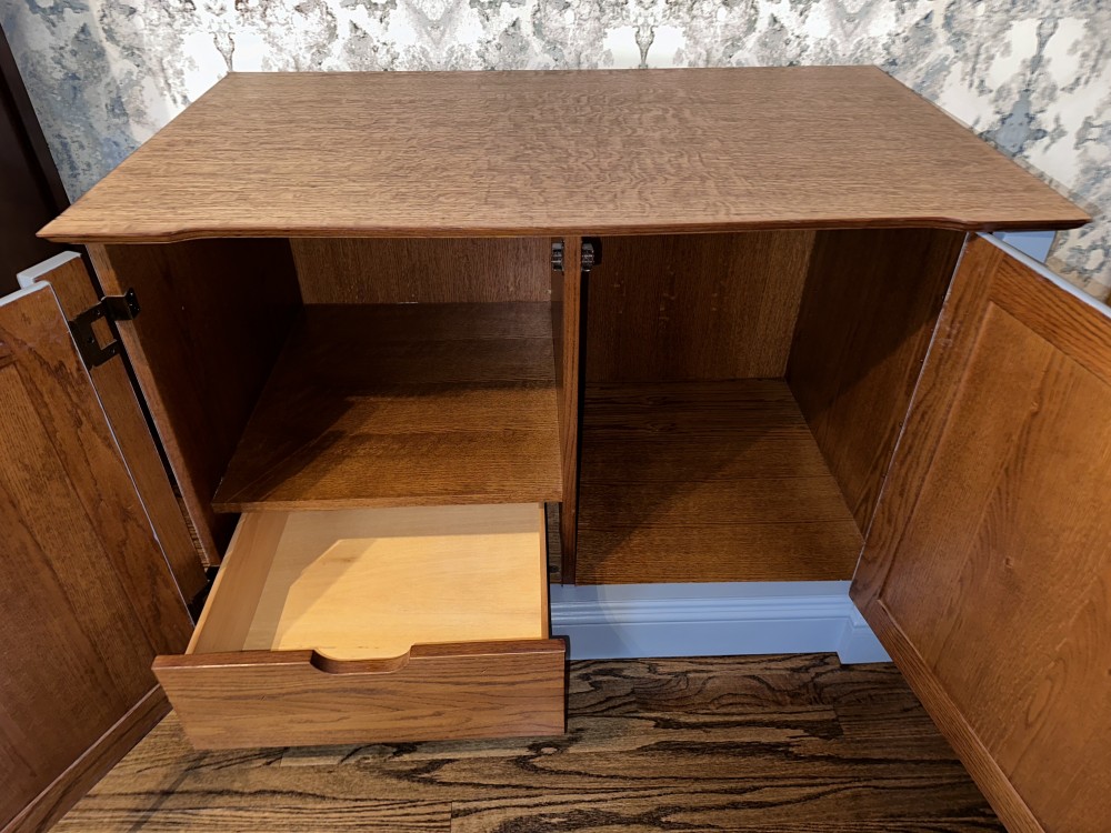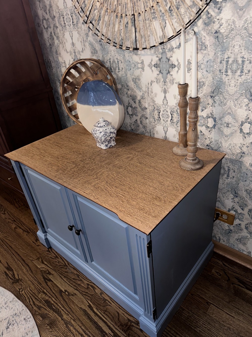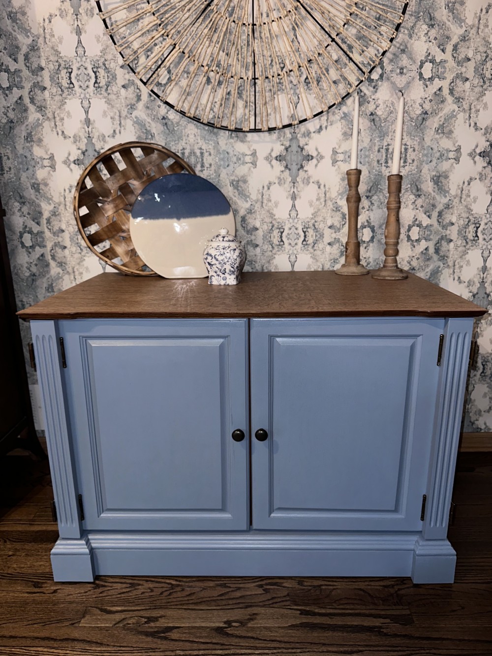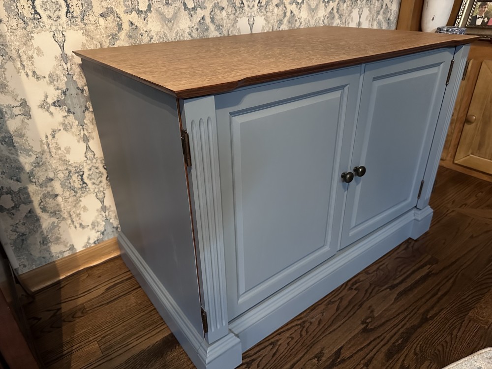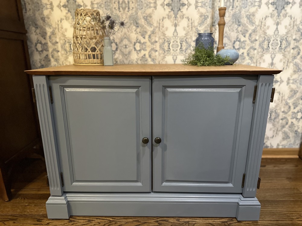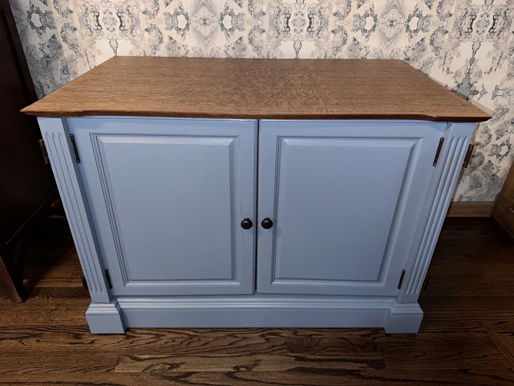 This cabinet has room for tons of storage! We refinished it in the color cornflower blue after sanding and staining the top. Then we added a polyurethane varnish to all surfaces. The possibilities for ways to use this piece are endless! It could serve as a buffet/sideboard, game cabinet, hidden printer/office storage, entryway drop zone, etc.