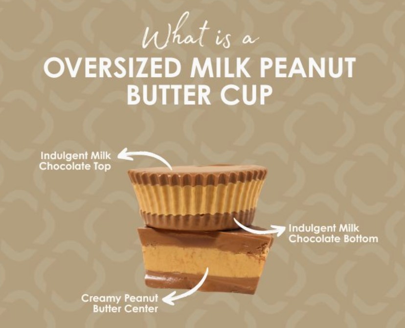 Oversized chocolate peanut butter cup. 2.5 oz of smooth milk chocolate on the top and bottom with a middle layer of creamy peanut butter goodness.