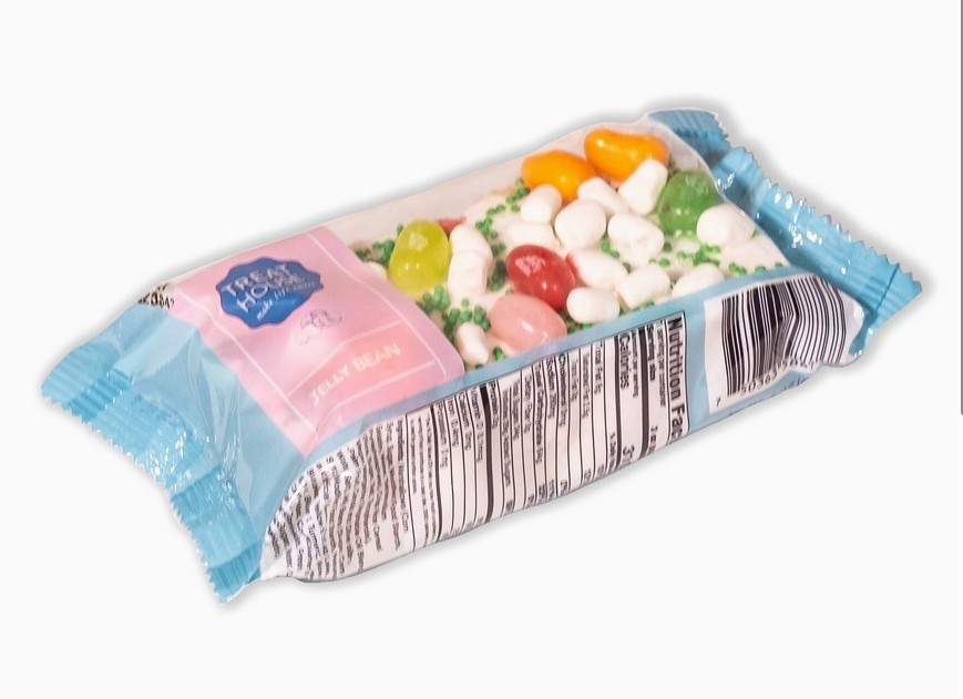 Rice Krispie Treat Bar topped with green sprinkle "grass", home made marshmallow topping, and colorful jelly beans.