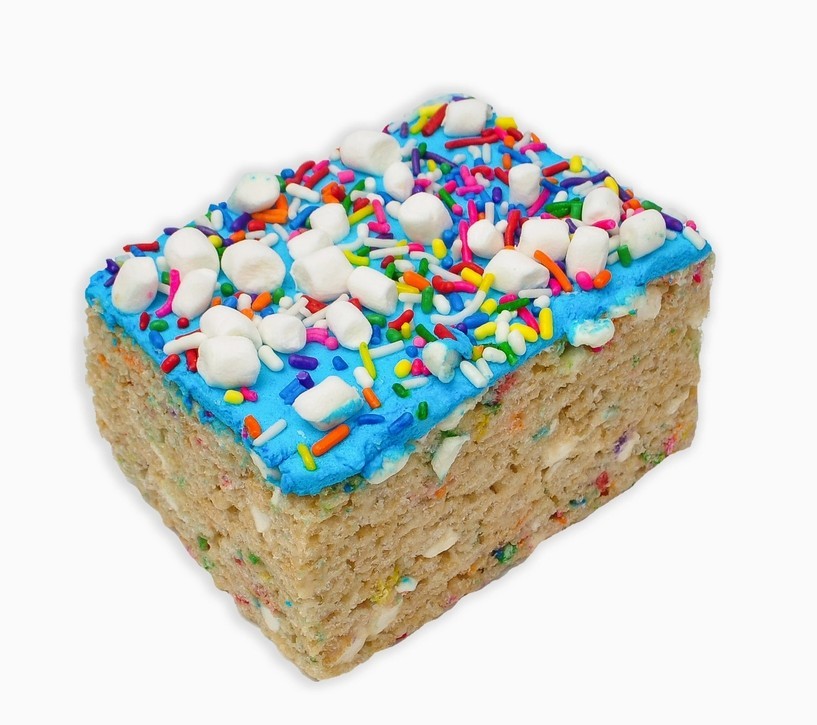 he base contains Tahitian vanilla paste, natural birthday cake flavor, and colorful sprinkles. The treat is topped with blue chocolate ganache, more sprinkles, and tiny marshmallows. **GLUTEN FREE, NUT FREE**