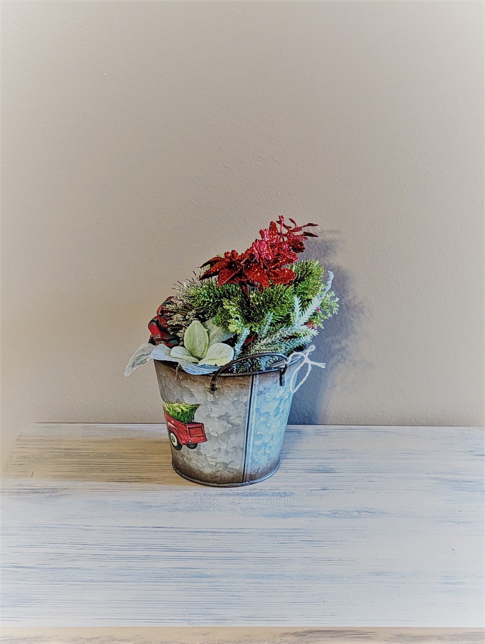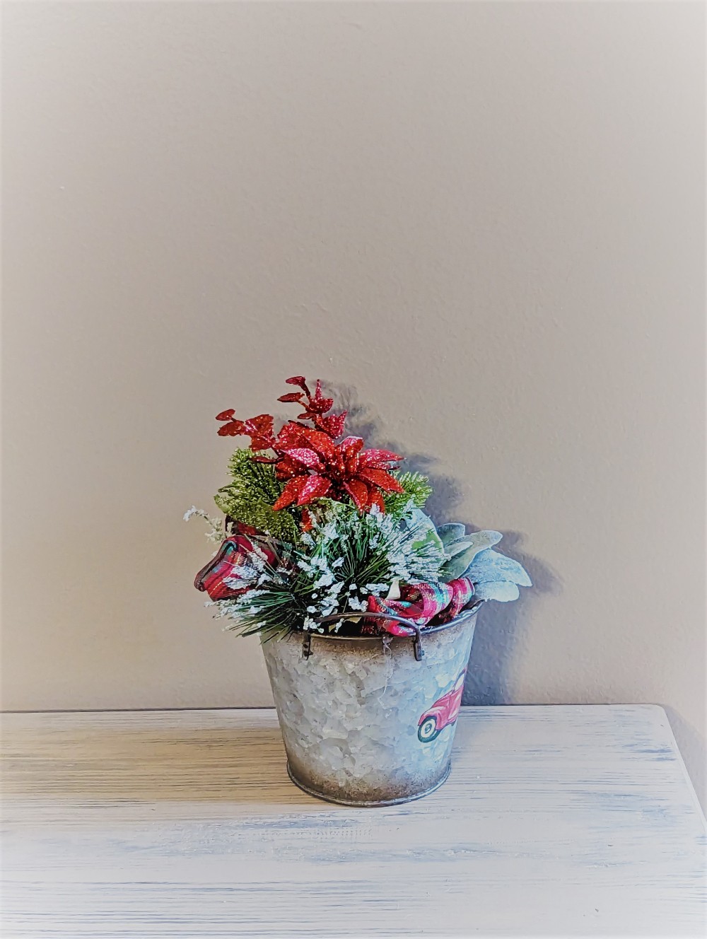 Cute metal pail featured with a red truck and filled with a beautiful poinsettia plant8"x5"