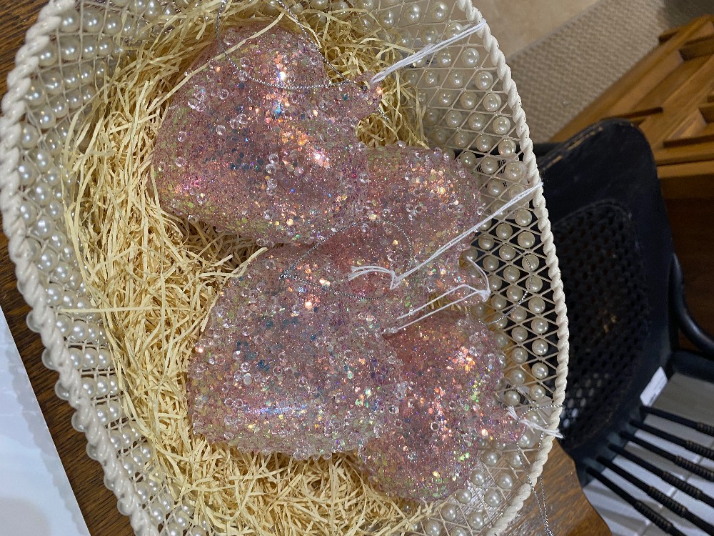 Pink glitter 4” glass heart ornament.