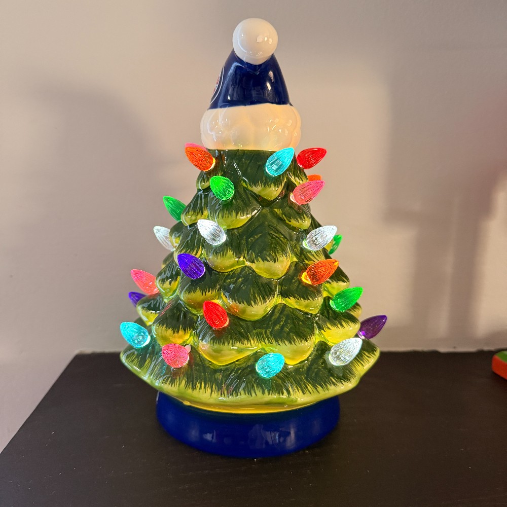 Add a festive touch to your holiday décor with this Chicago Cubs light-up ceramic Christmas tree! Standing at 8 inches tall, this collectible piece features vibrant multi-color bulbs and a glossy finish that beautifully glows when lit. Topped with a Cubs Santa hat and set on a sturdy base with the official Chicago Cubs logo, it’s the perfect decoration for any Cubs fan.