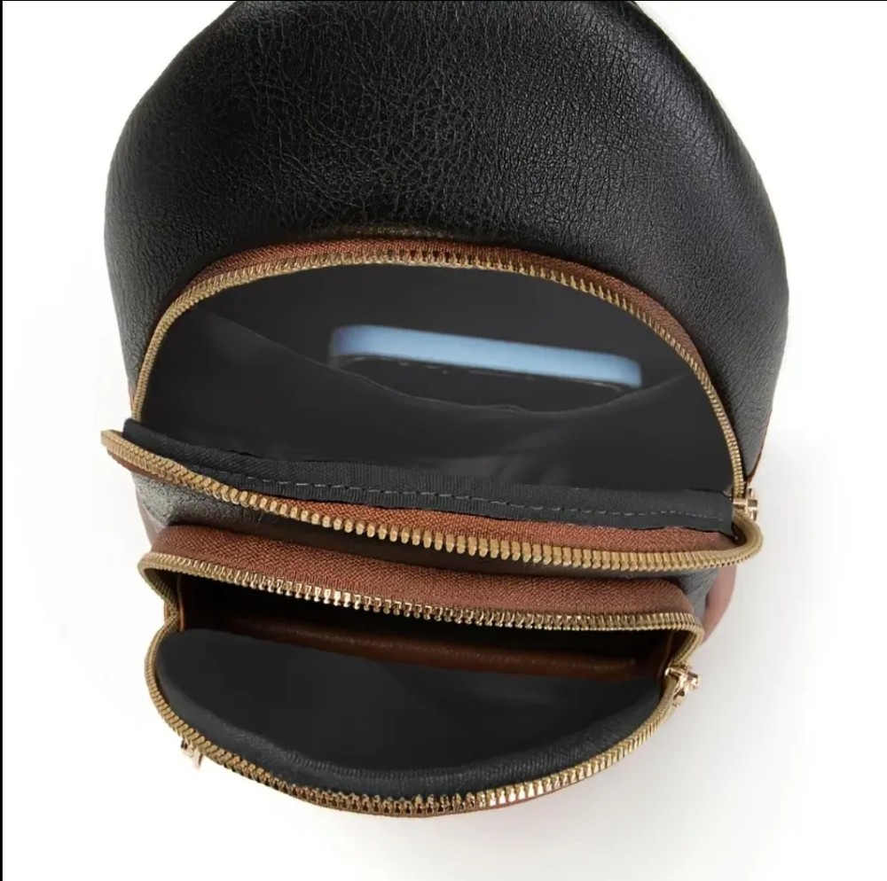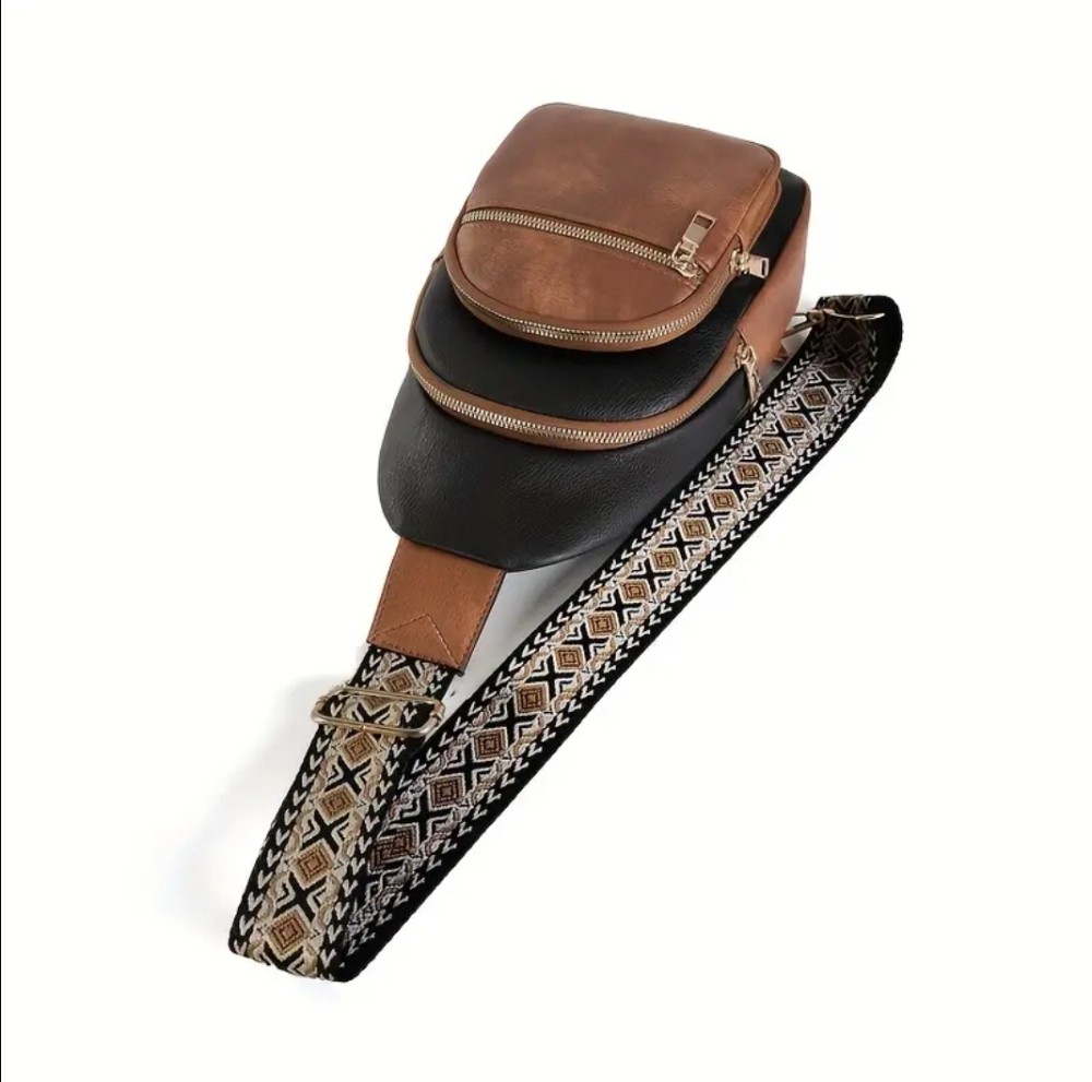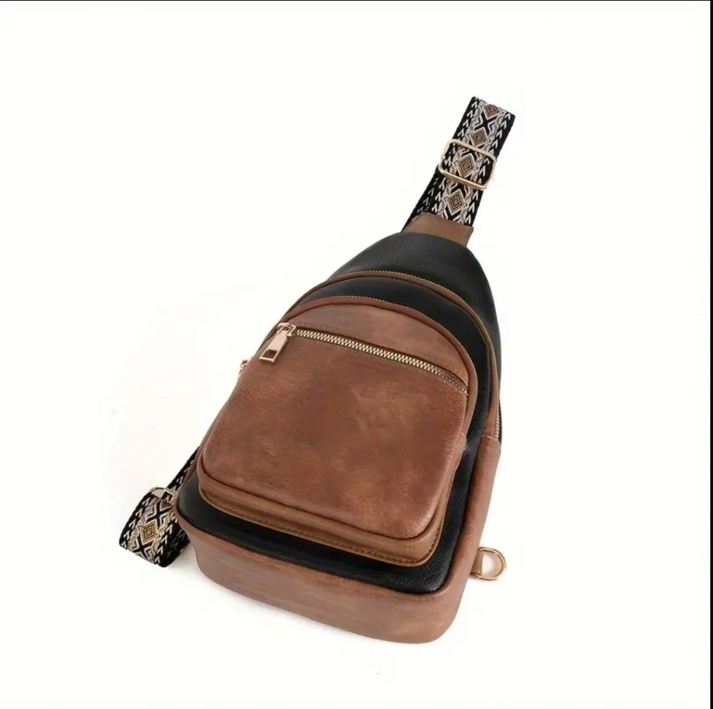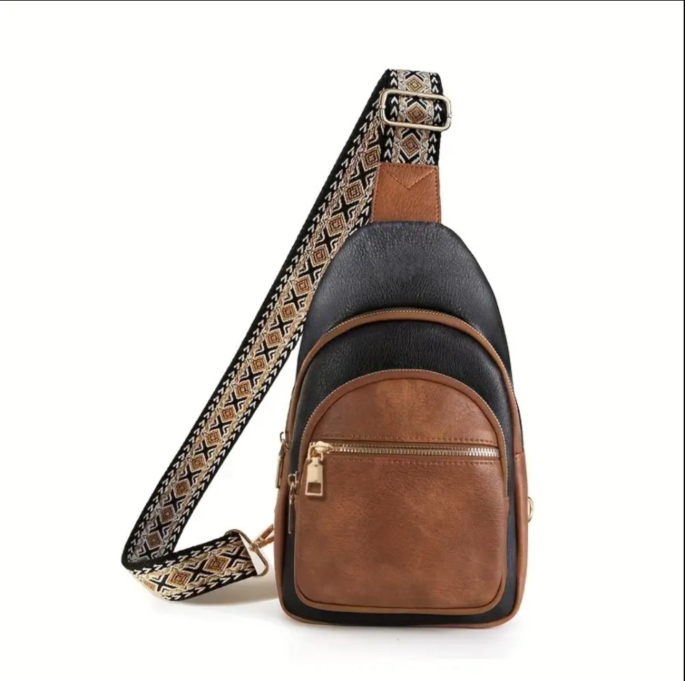 3 Zipper pockets w slip pockets inside. Adjustable strap, can also clip strap to either side.