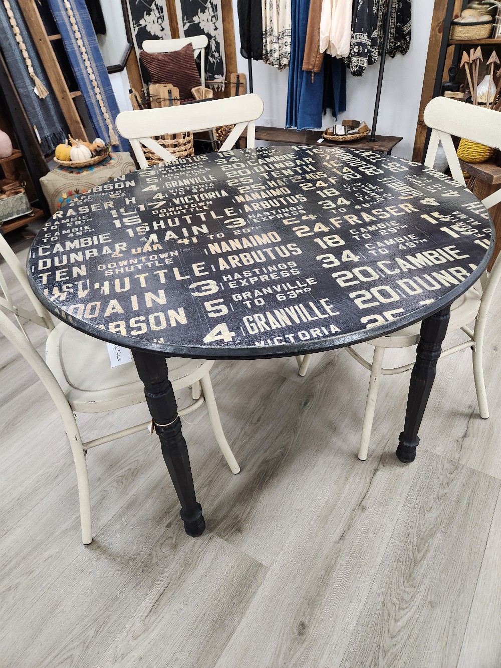 Handcrafted Dining Table, Subway Series design. This One-of-a-Kind table features solid wood construction and a uniquely finished top. Protected with polyurethane and a hard wax oil.