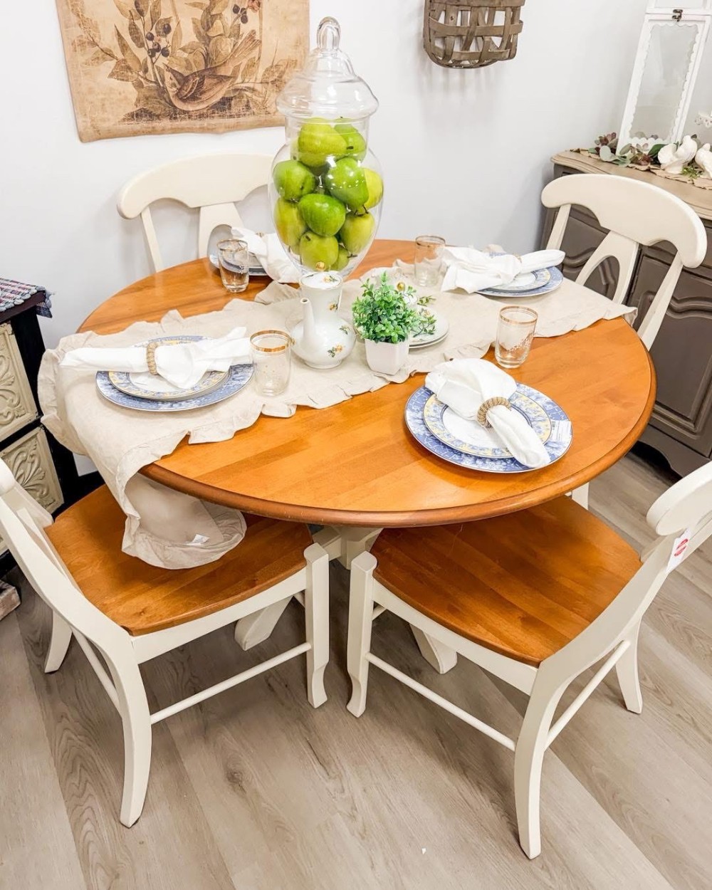 46” round table. No leaf. Cream base. Stained top has a tiny chip, not perfect. Chairs have a stained seat and cream frame.