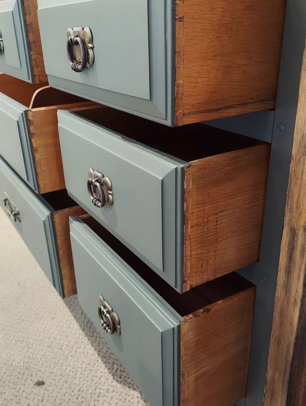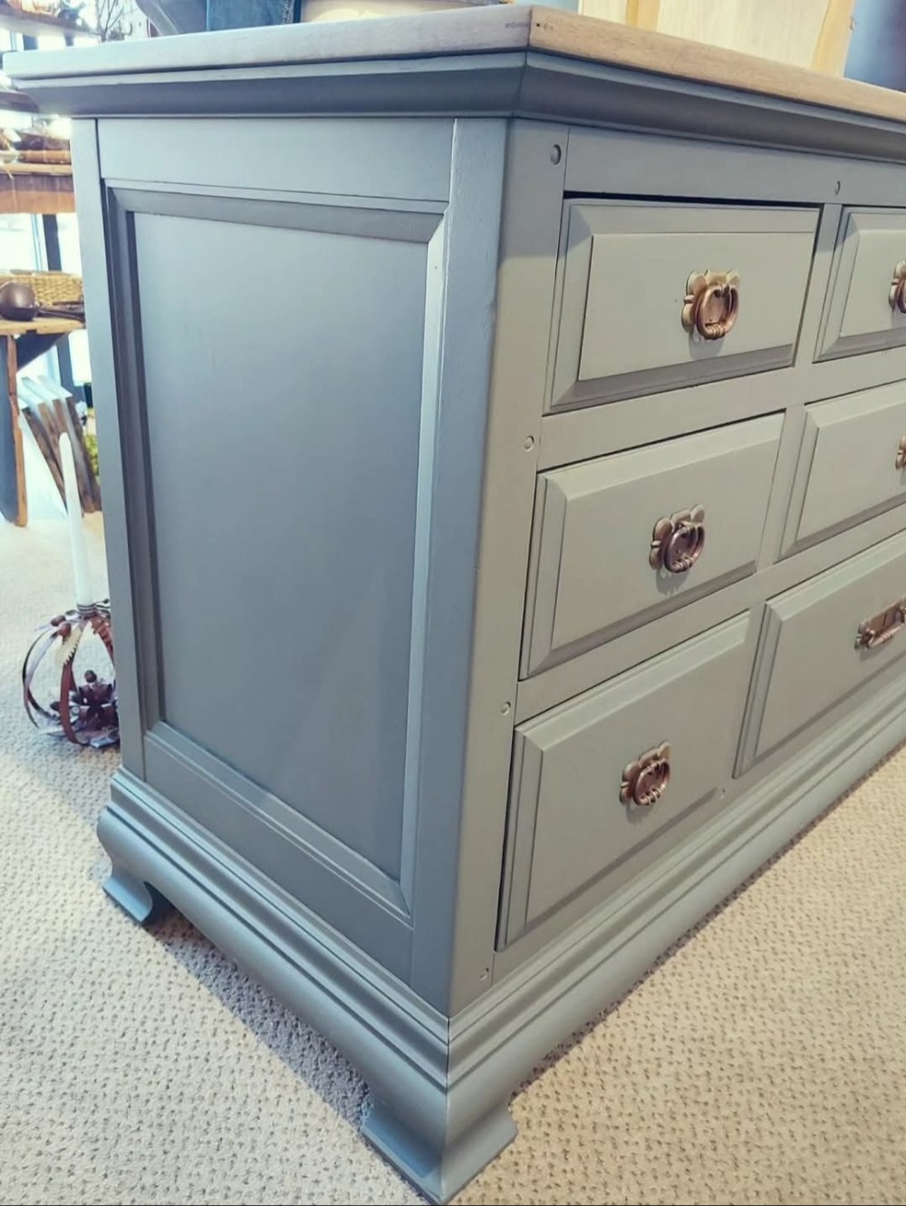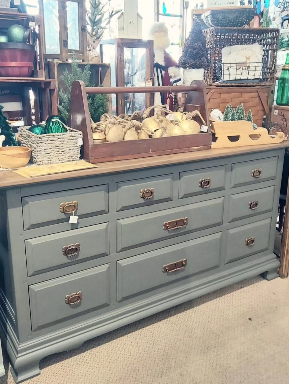 This Solid Wood 10 Drawer Dresser is now in store! Painted in a neutral green with grey undertones, while the top (with bow tie inlays) was sanded, stained, and sealed with @generalfinishes flat top. All 10 dovetail drawers have their original brass hardware, and the center drawer divided for easier storage. This piece is solid, sturdy, and heavy! It would be great in the bedroom, and even under a tv. See this and more in my space at The Rustic Fox. π