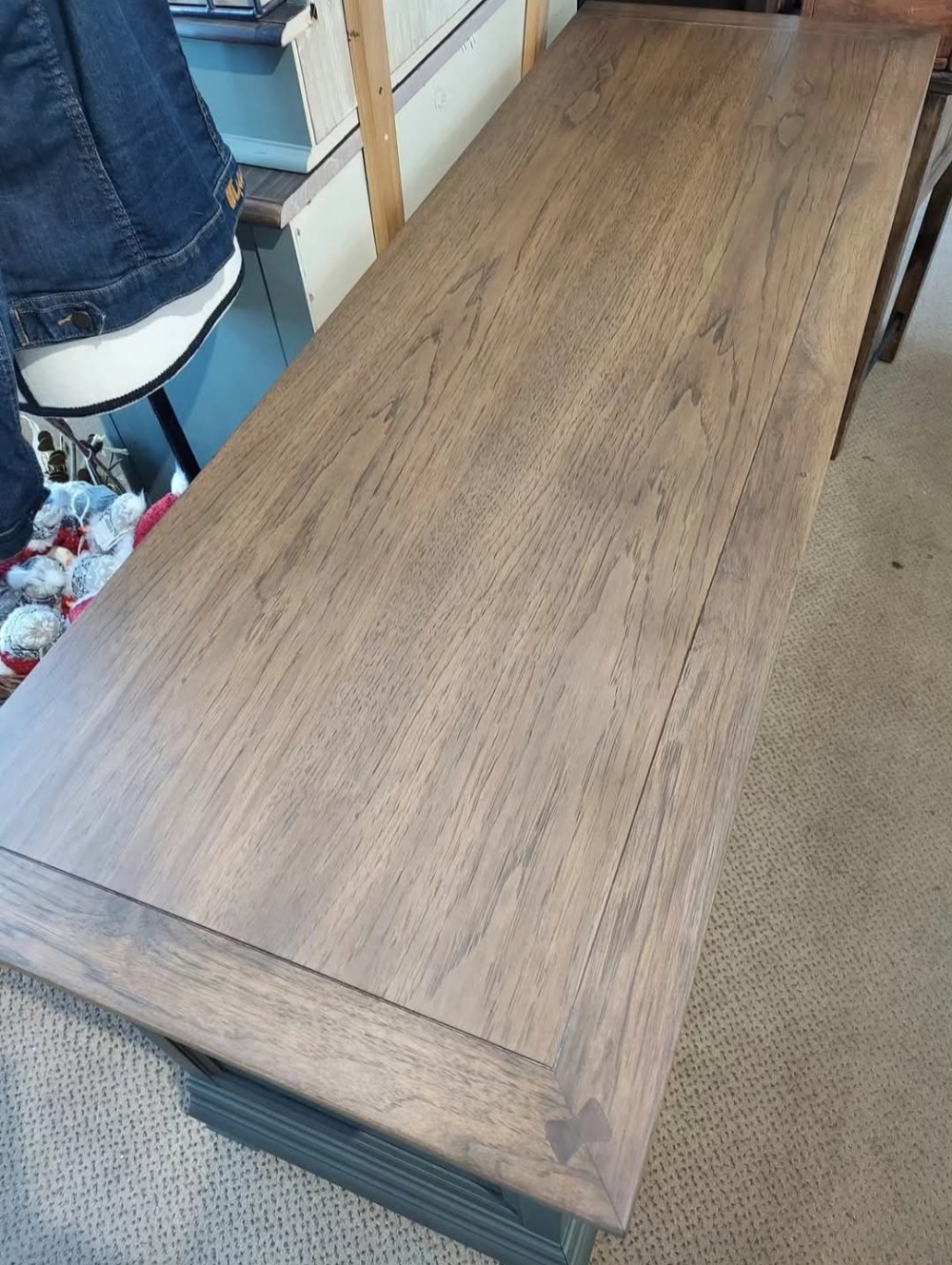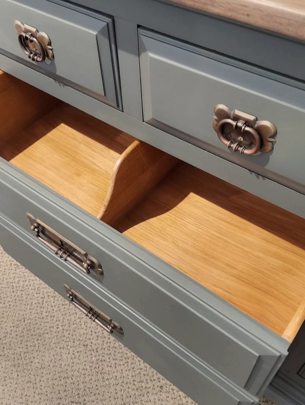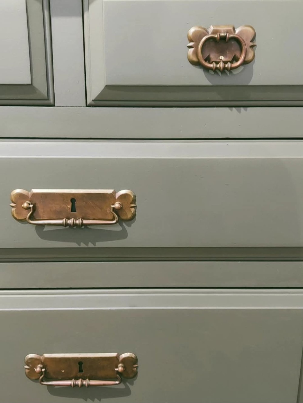 This Solid Wood 10 Drawer Dresser is now in store! Painted in a neutral green with grey undertones, while the top (with bow tie inlays) was sanded, stained, and sealed with @generalfinishes flat top. All 10 dovetail drawers have their original brass hardware, and the center drawer divided for easier storage. This piece is solid, sturdy, and heavy! It would be great in the bedroom, and even under a tv. See this and more in my space at The Rustic Fox. π