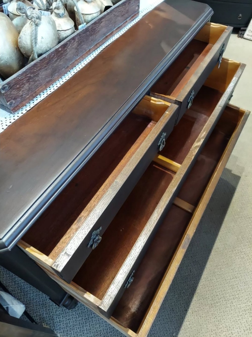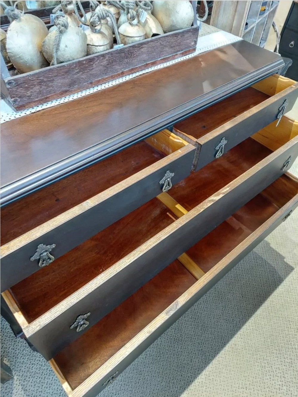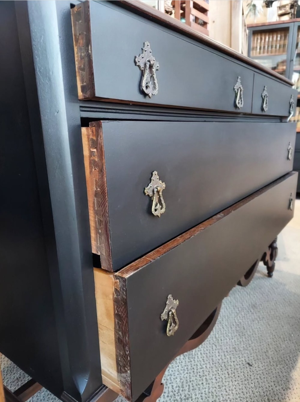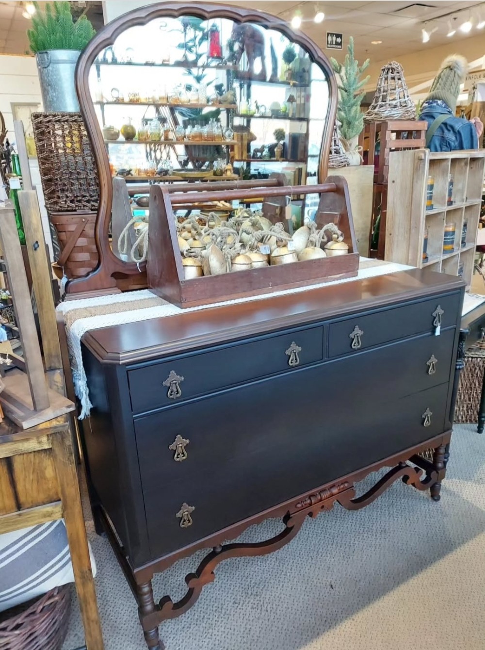 This antique black dresser is now in store! The body painted black satin, while mirror frame, top, and decorative bottom were conditioned to keep their original look. I added a few layers of protection to the top to let the original ombre center show through. All 4 dovetail drawers have original brass pulls, and the decorative bottom pulls it all together. The mirror can detach, and the dresser rolls on original wood caster wheels for easier transport. This dresser would make a beautiful statement piece in any moody space! See this and more in my space at The Rustic Fox. 😊