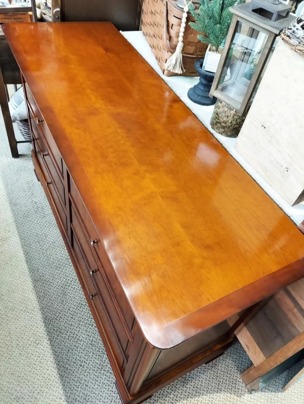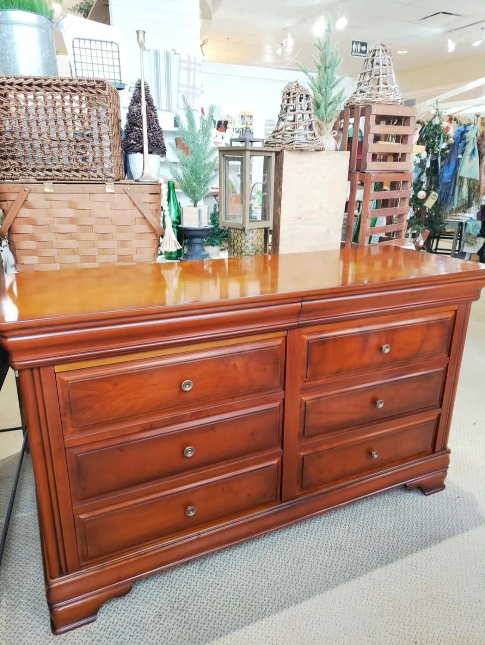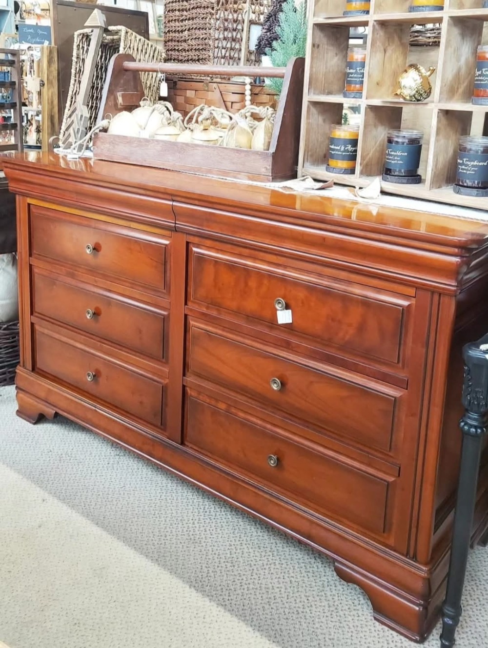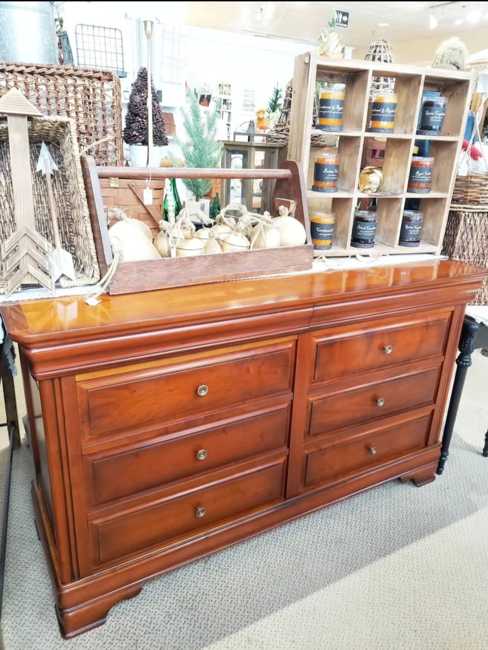 Now in store is this beautiful wooden 8 (yes, there are 8) drawer dresser! I was getting ready to do my usual sand-stain-paint-and seal on this piece, but it was in such great condition and the wood was so beautiful that I couldn't bring myself to cover it it up. So I did a good cleaning, and conditioned the wood to make it pop. 6 of the 8 drawers are dovetail, the 2 top "secret" drawers blend in with the dresser as if they're part of the trim, and all 8 are gorgeous inside and out. This piece would make a wonderful warm addition in the bedroom or even under the TV! See this and more in my space at The Rustic Fox. 😊