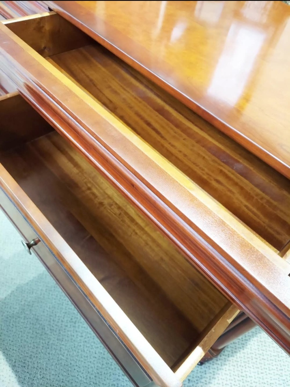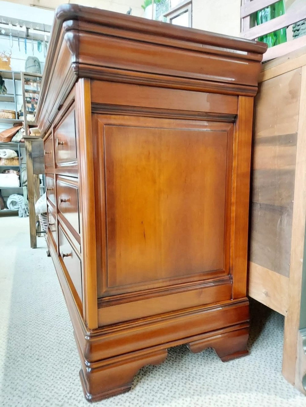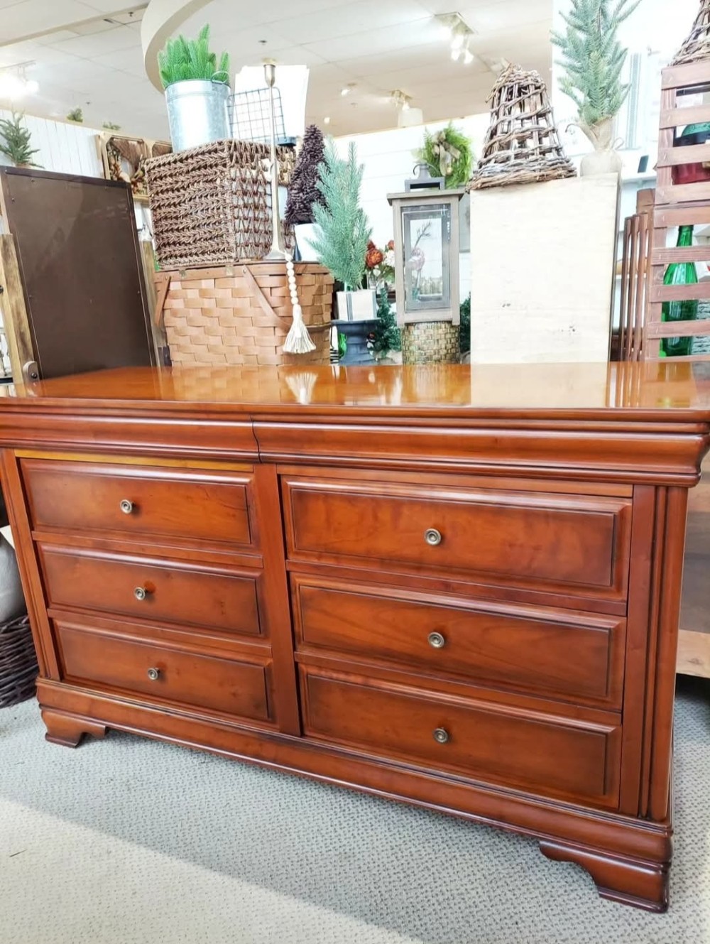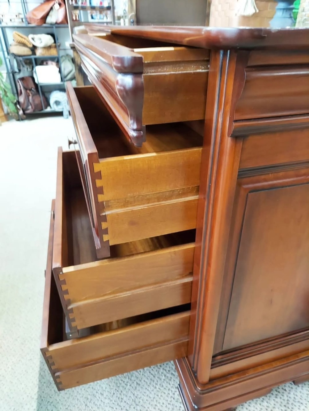 Now in store is this beautiful wooden 8 (yes, there are 8) drawer dresser! I was getting ready to do my usual sand-stain-paint-and seal on this piece, but it was in such great condition and the wood was so beautiful that I couldn't bring myself to cover it it up. So I did a good cleaning, and conditioned the wood to make it pop. 6 of the 8 drawers are dovetail, the 2 top "secret" drawers blend in with the dresser as if they're part of the trim, and all 8 are gorgeous inside and out. This piece would make a wonderful warm addition in the bedroom or even under the TV! See this and more in my space at The Rustic Fox. 😊