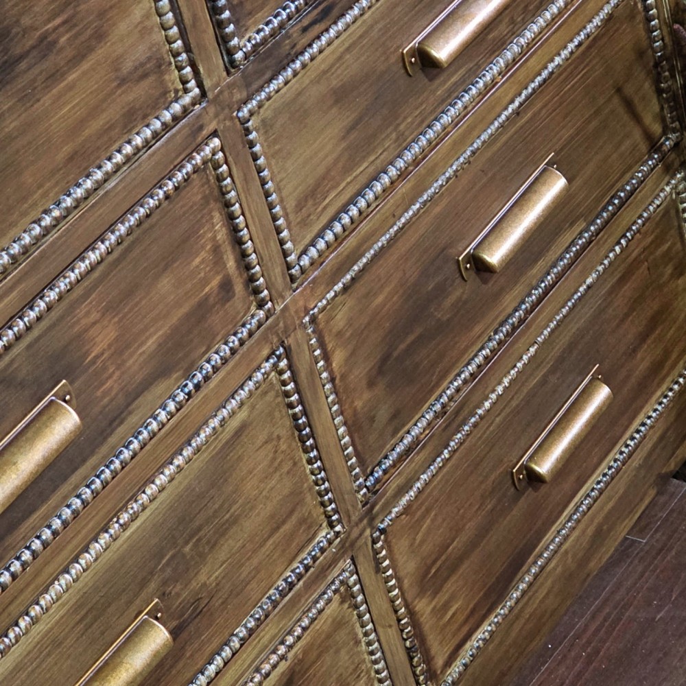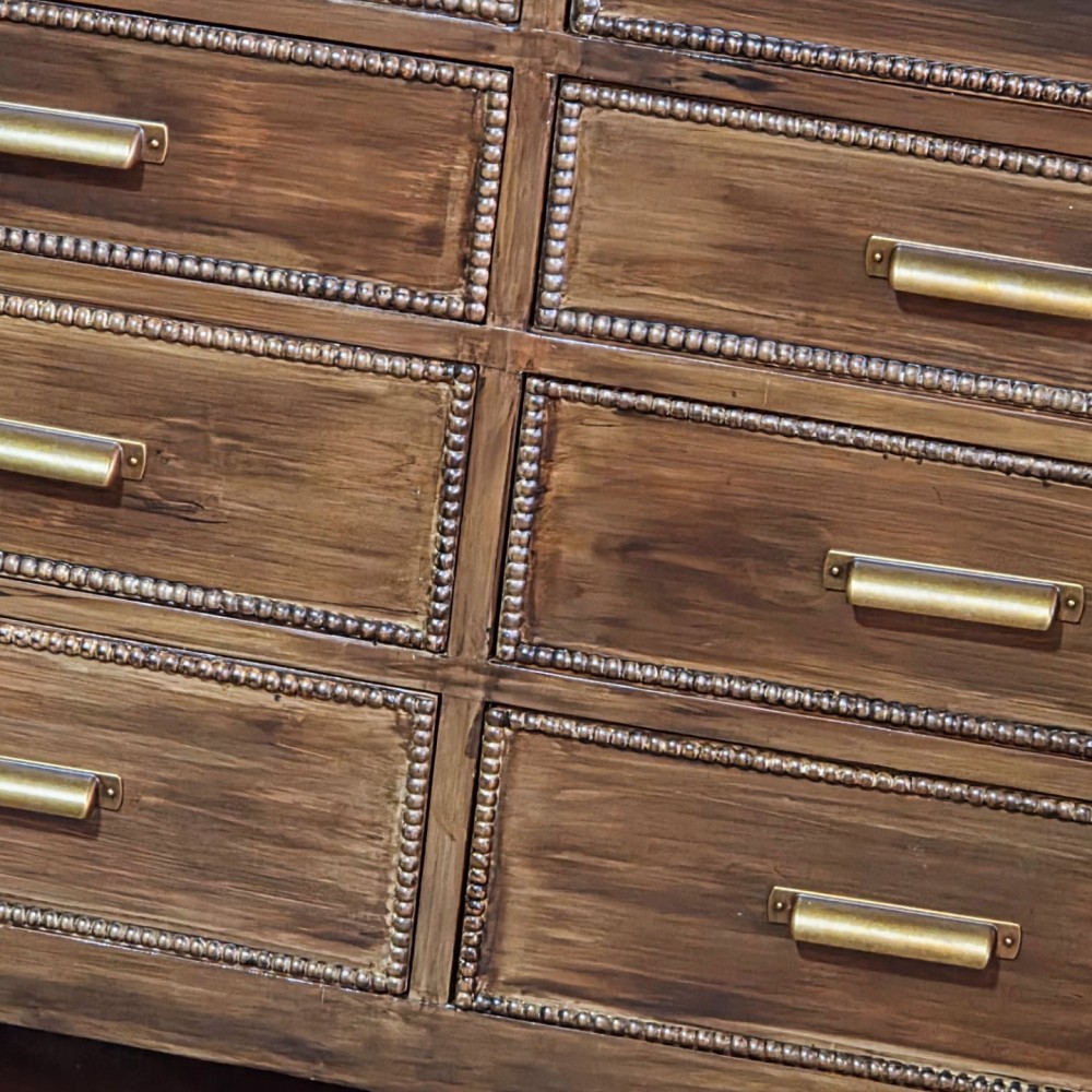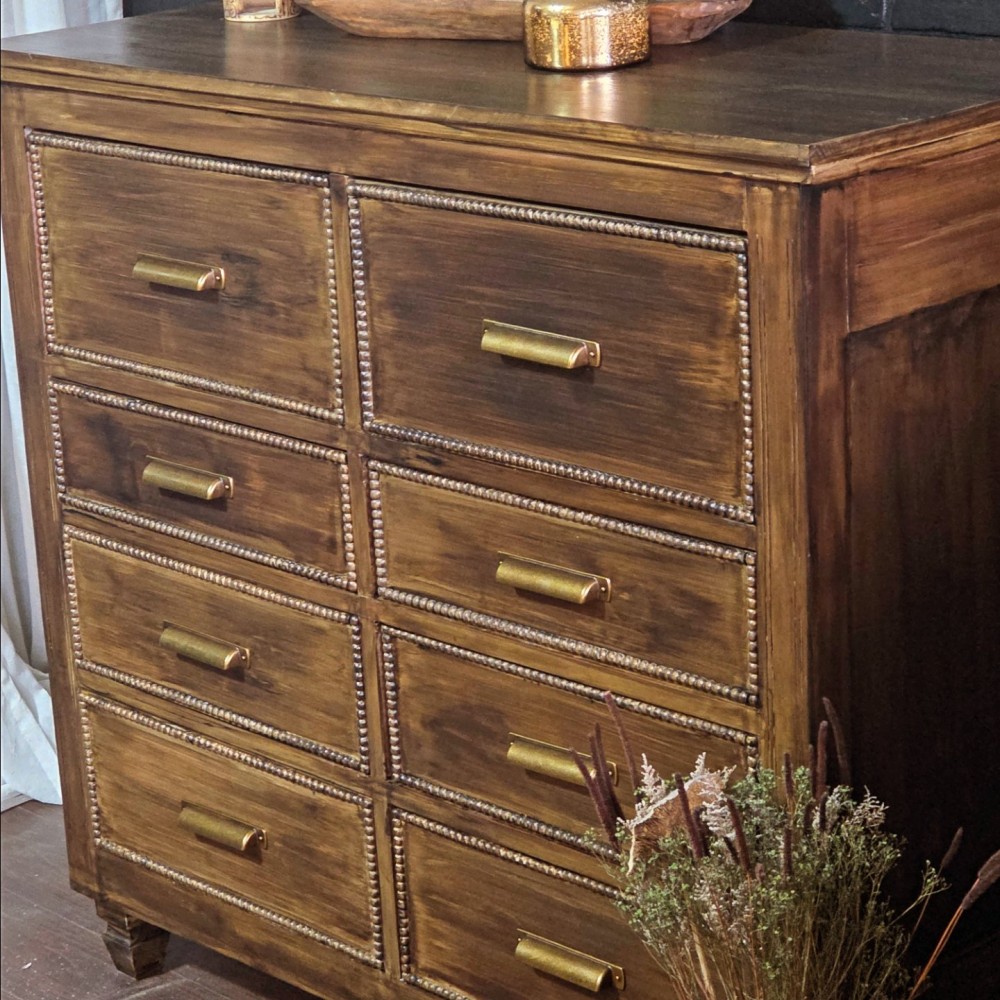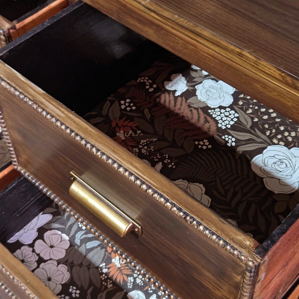 This handmade dresser got new bottom, new top and all beaded details. It was completely sanded, cleaned and paint washed before dark walnut stain applied. Sealed in a satin poly. All drawers in excellent working condition and fully lined. New hardware as well as new legs.