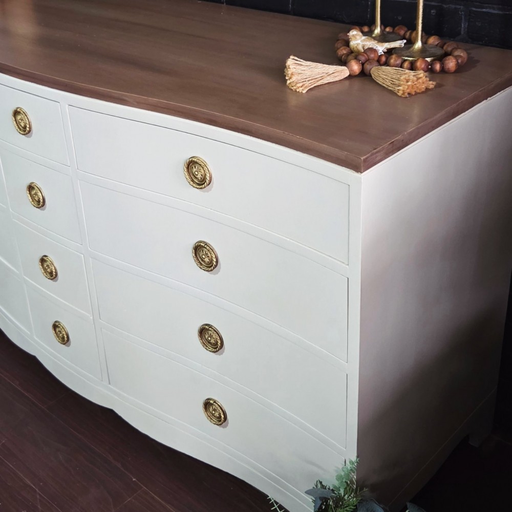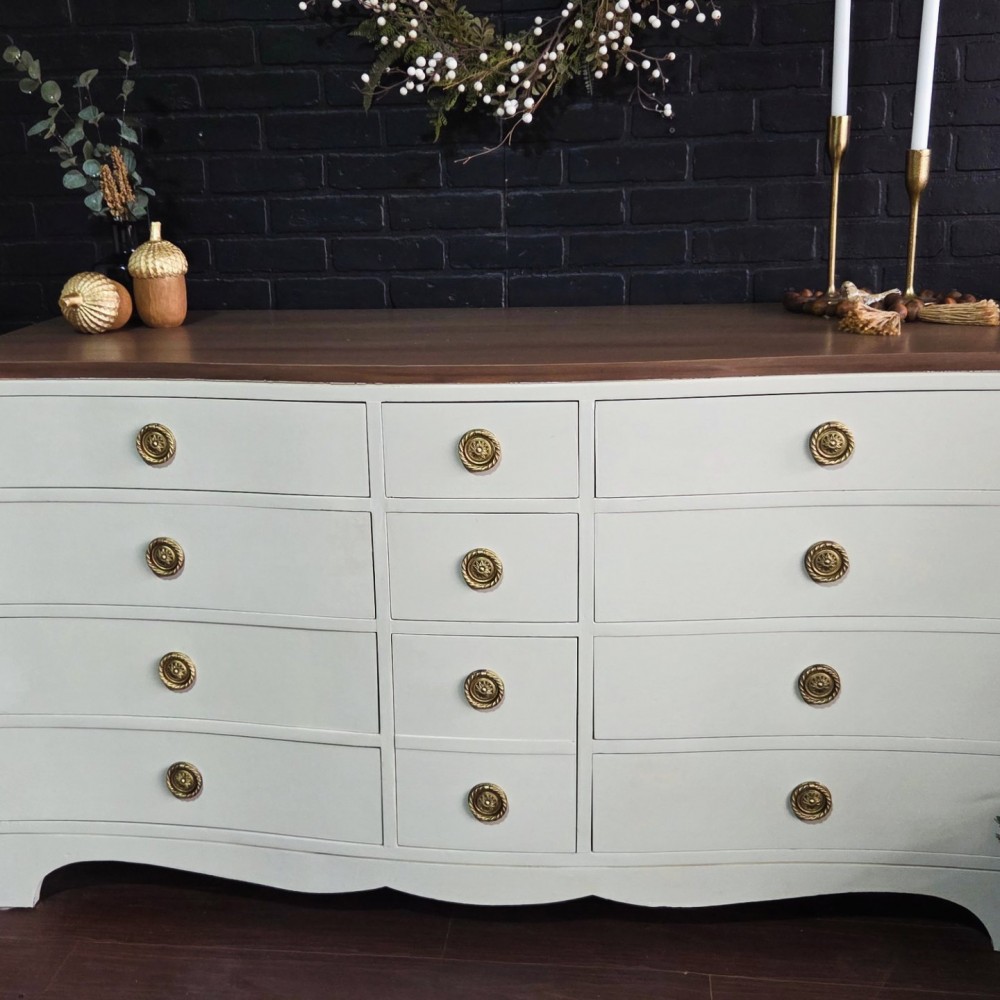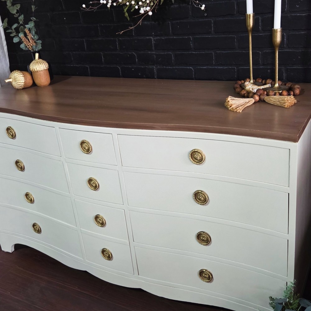 Painted in Fusion Mineral Paint #chateau. Top completely sanded, paint washed in #algonquin and Lilly Moon Paint gel stain #mudslide applied over it. Sealed 3x in satin poly for durability and protection.