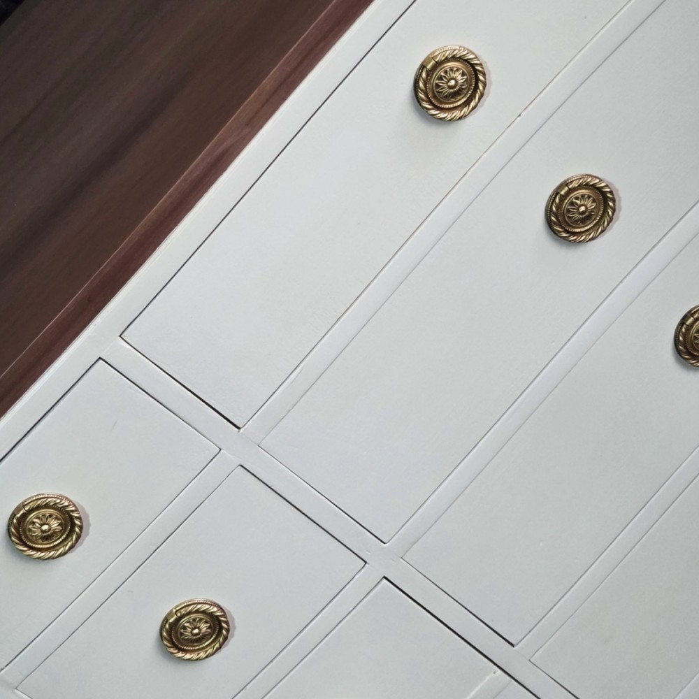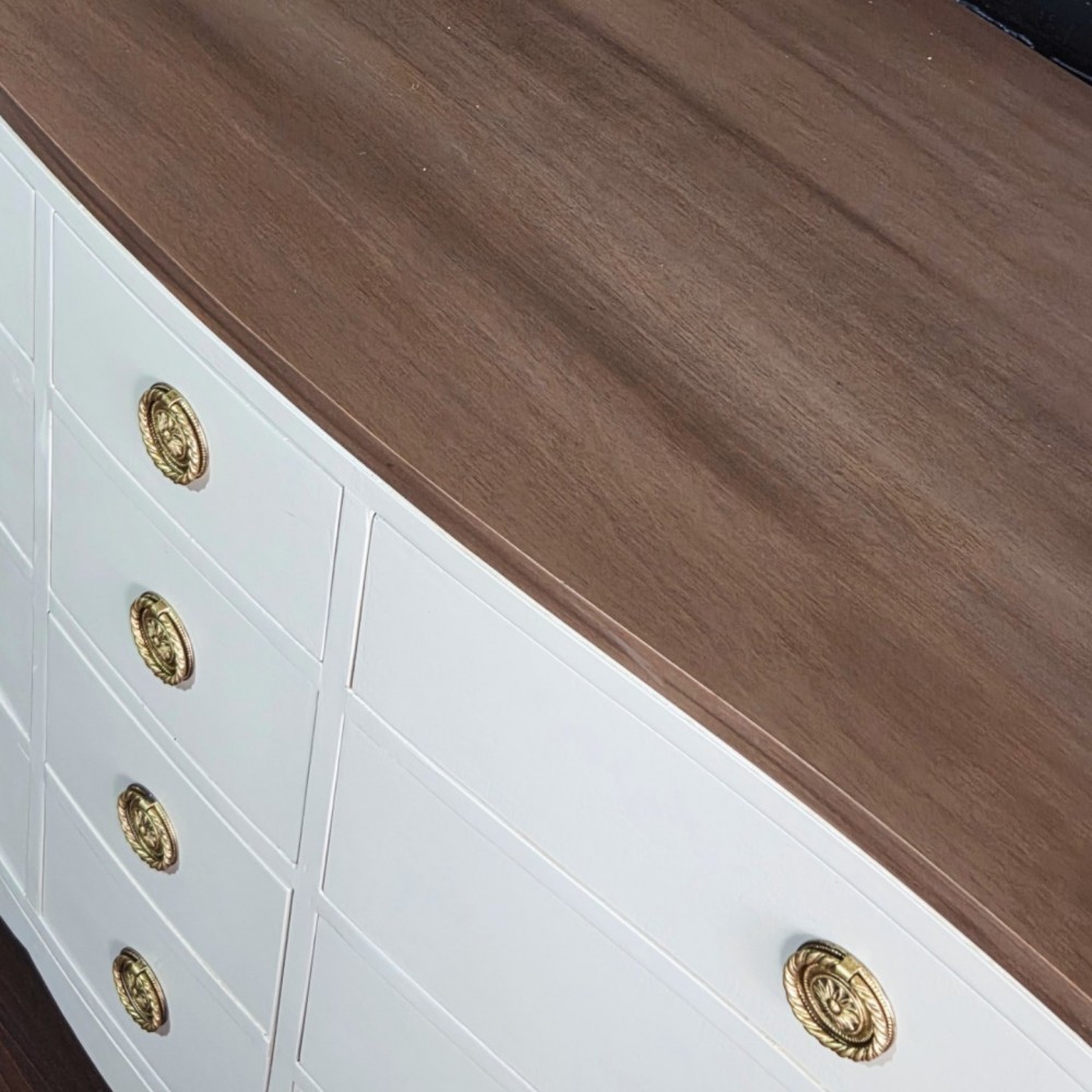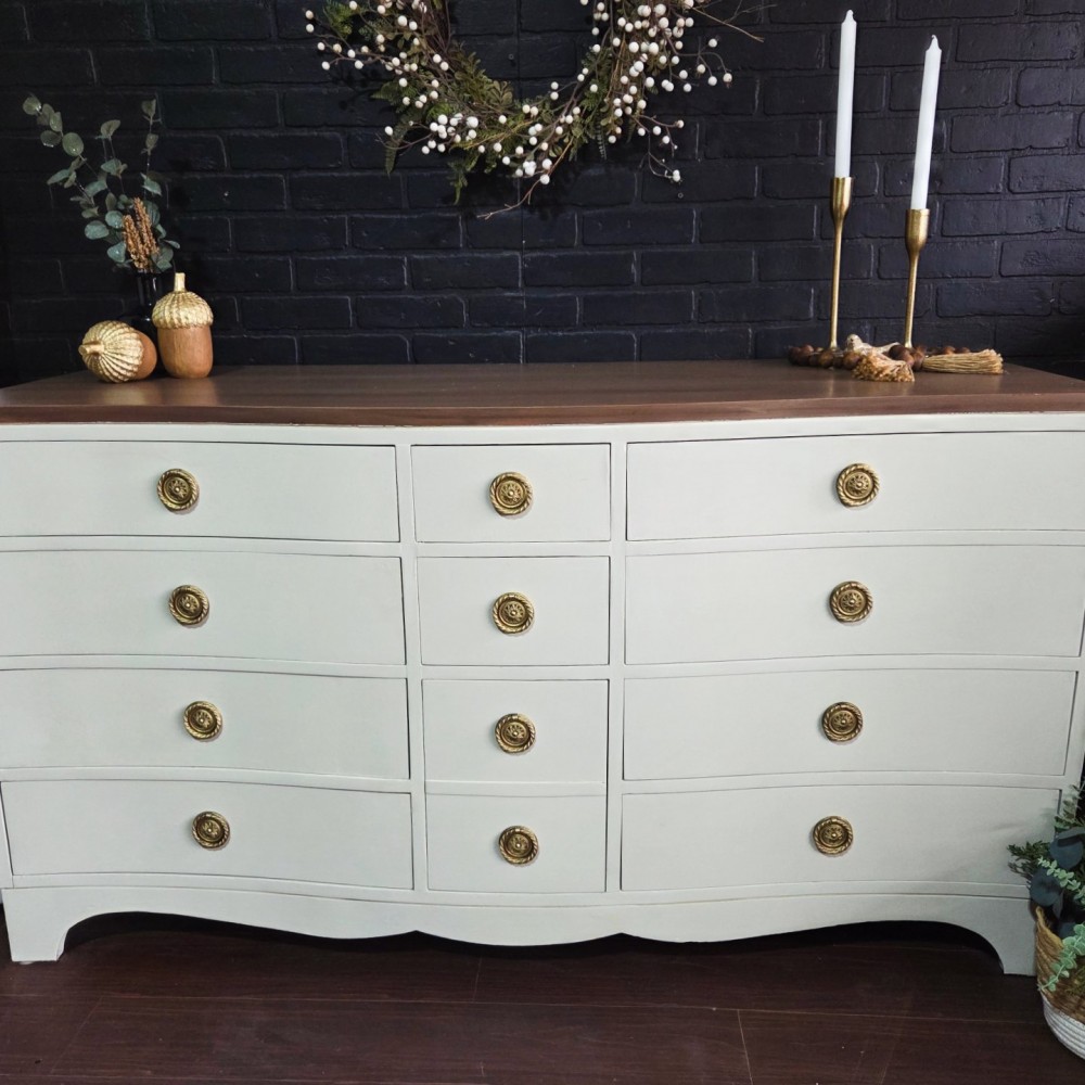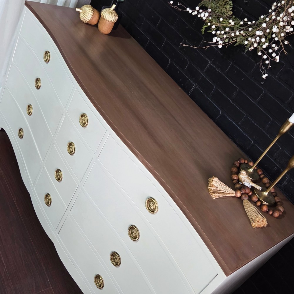 Painted in Fusion Mineral Paint #chateau. Top completely sanded, paint washed in #algonquin and Lilly Moon Paint gel stain #mudslide applied over it. Sealed 3x in satin poly for durability and protection.