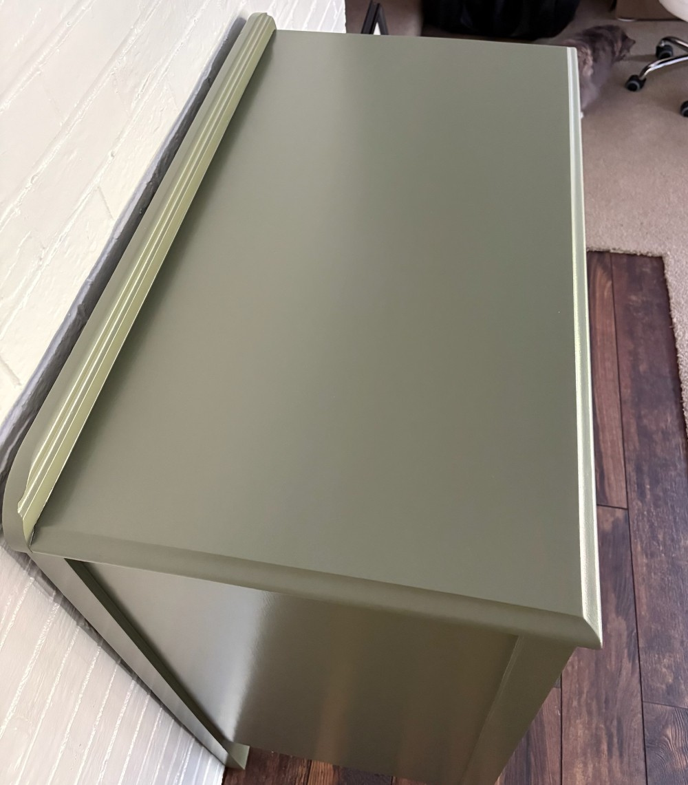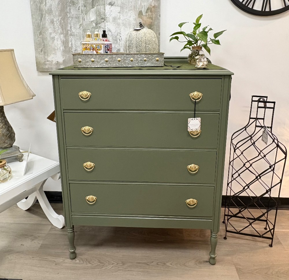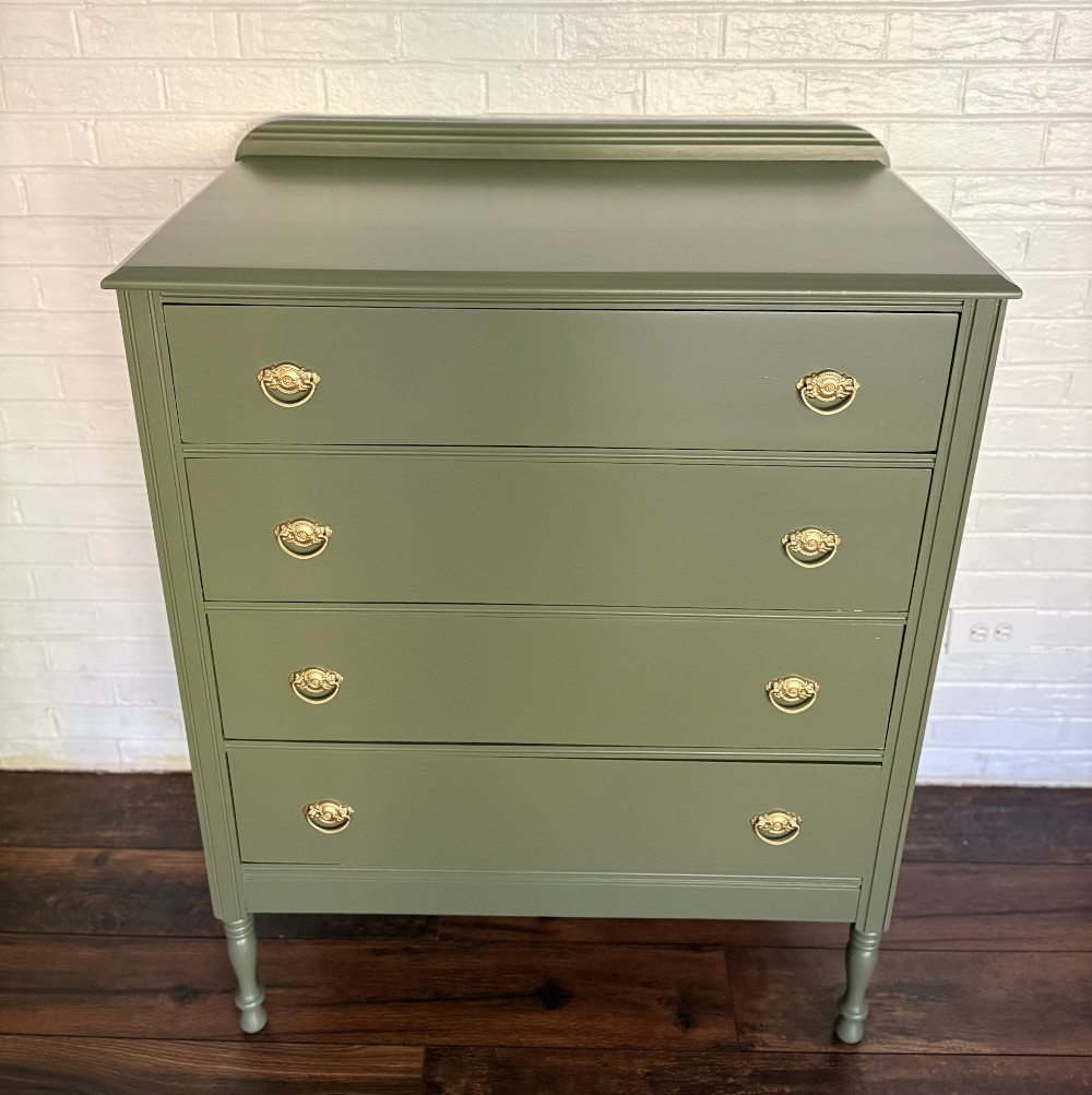 Sweet Vintage 4 Drawer Dresser. Pretty old piece that was in great shape before it was finished with Benjamin Moore Advance Satin. Gorgeous color is Jade Romanesque (#476). Measures 34x43x19 deep. Drawers glide easy.