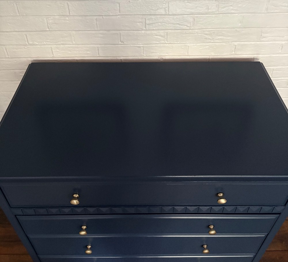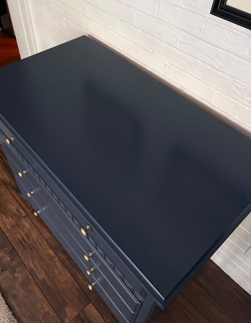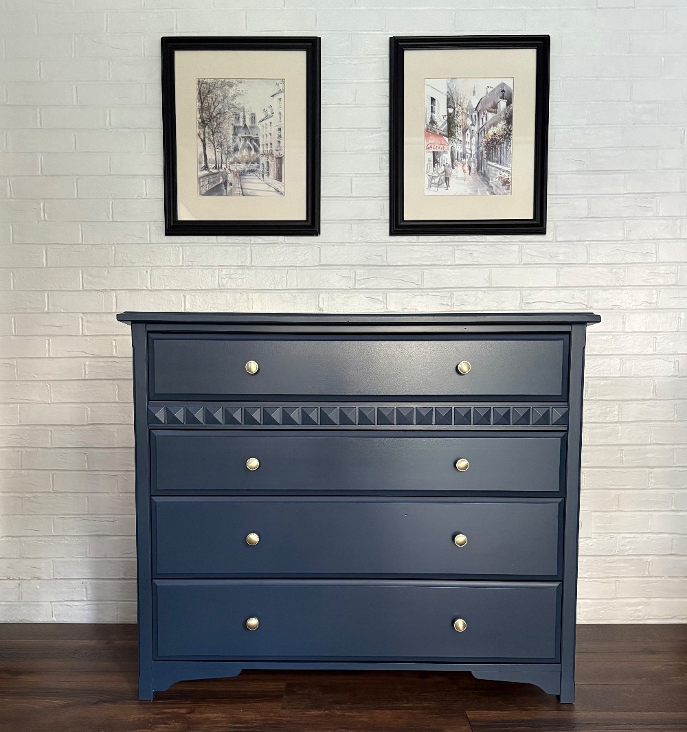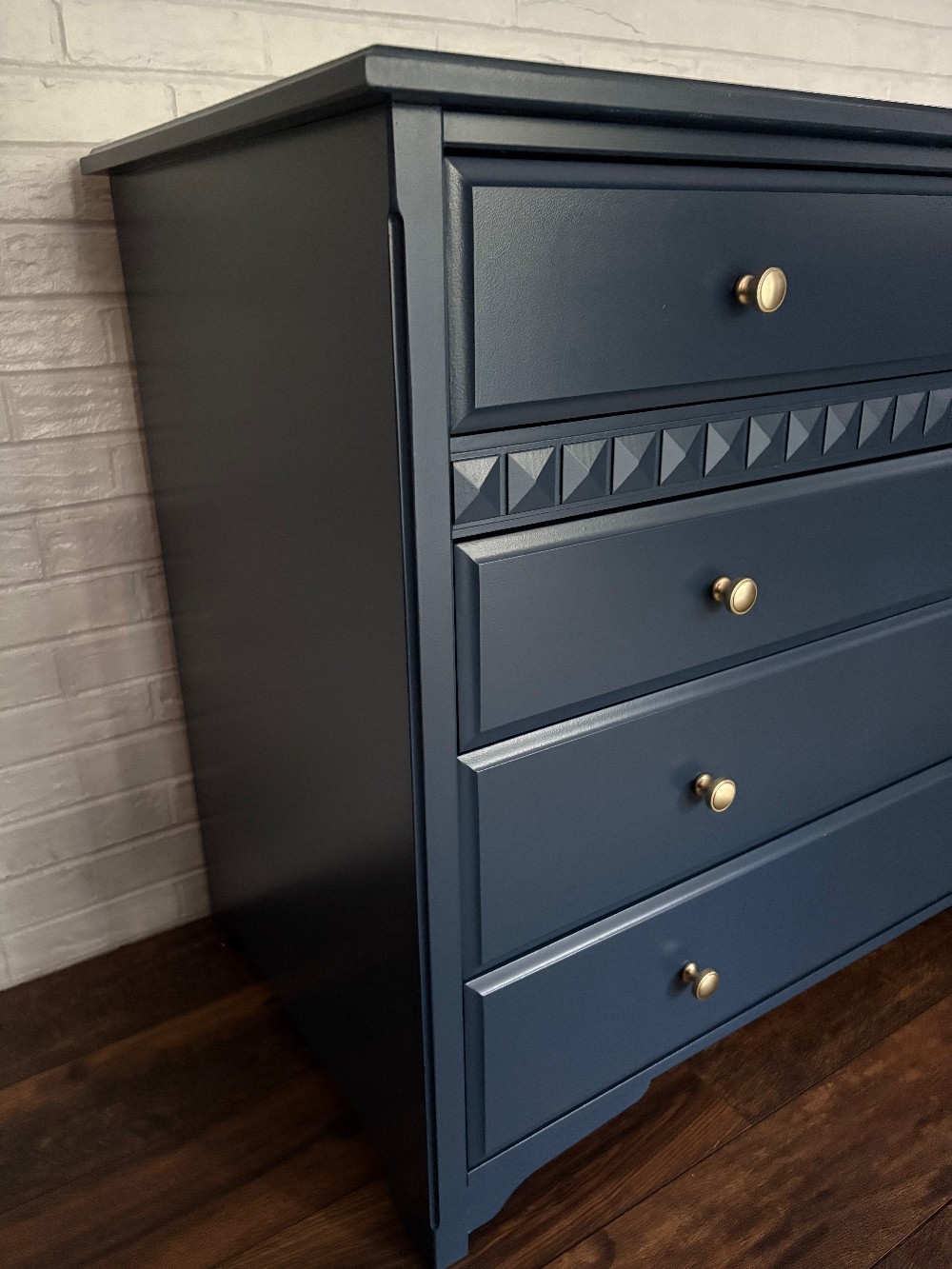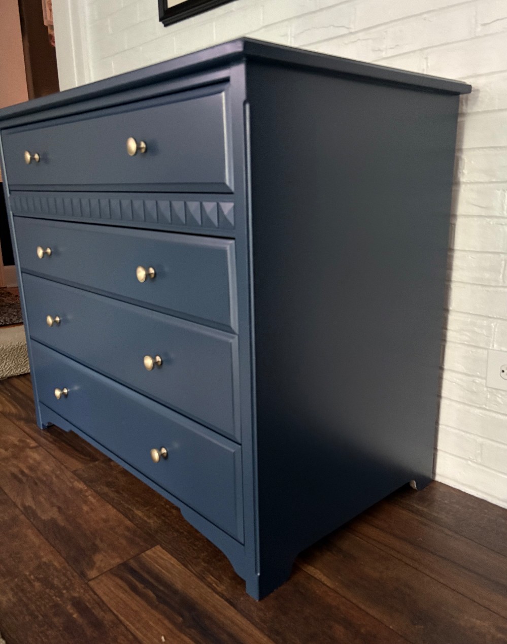 Super solid, awesome dresser. This color is outstanding! It’s called Deep Royal by Benjamin Moore. 43x23.75x36 high. Easy glide drawers & very clean. Comes with touch up paint.