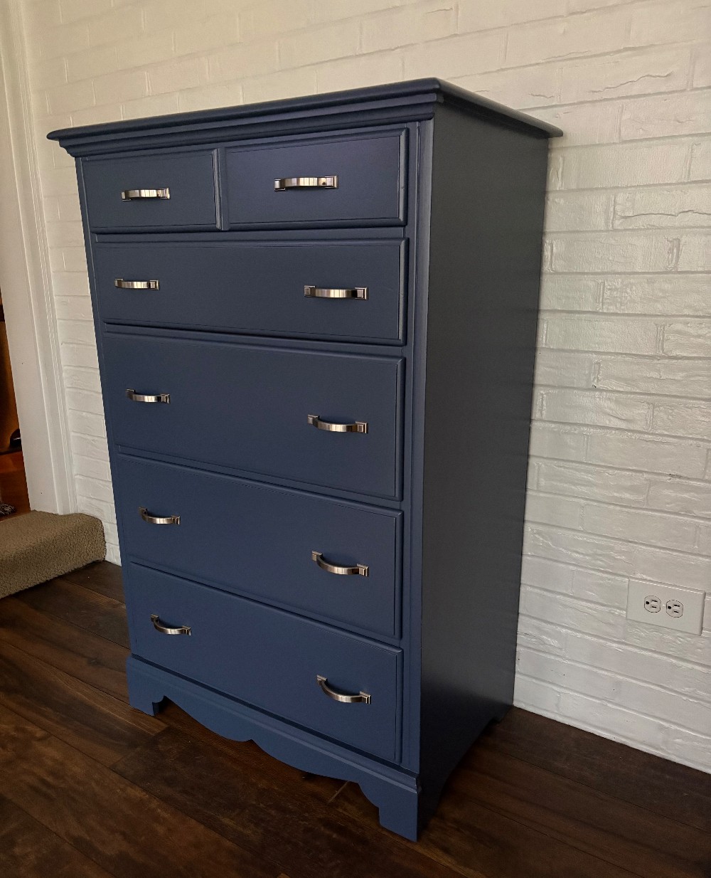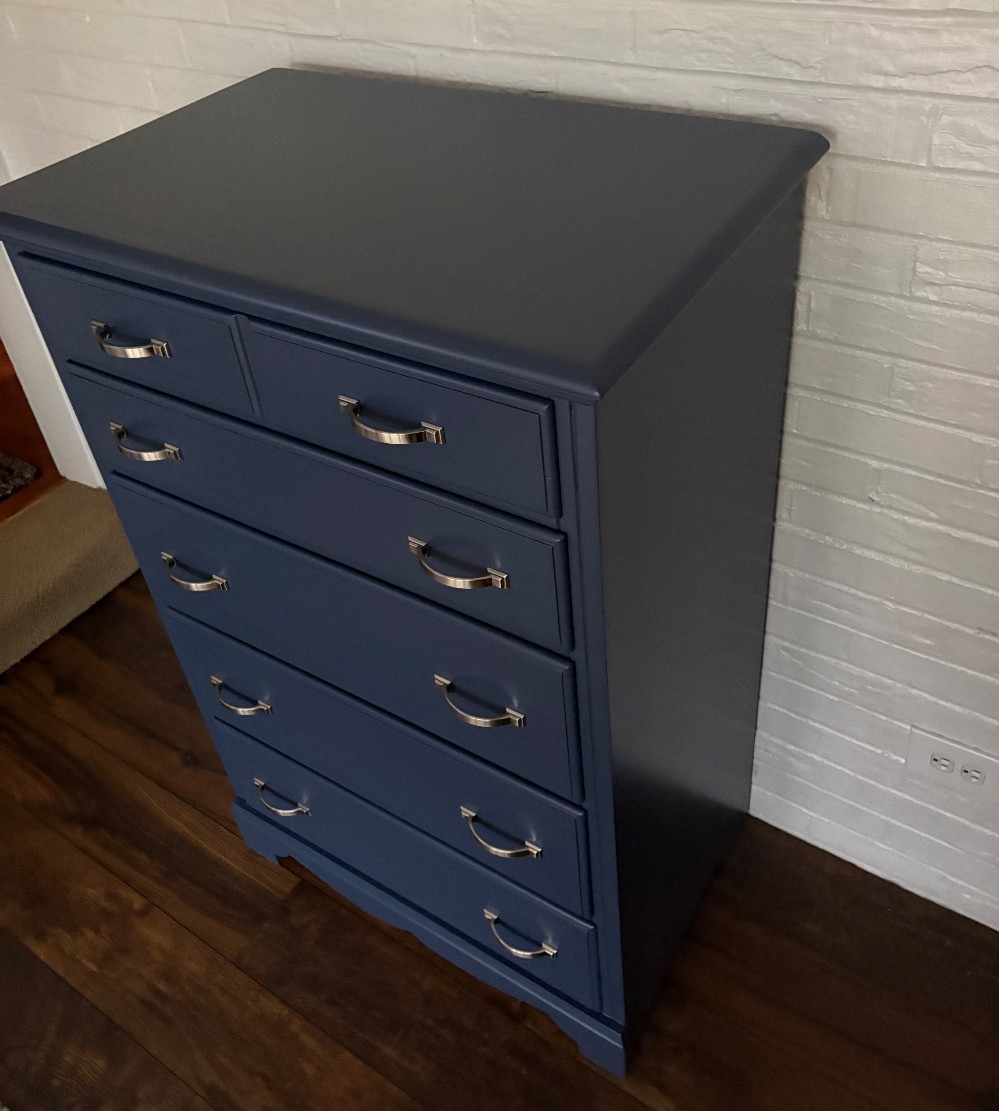 Great Color! 😍 Navy dresser I finished using Benjamin Moore Advance Satin. Primed with Stix primer. This Early American Dresser was full of nicks & dents. Many filled & sanded but some were not deep enough to hold wood filler but the silky finish literally forgives all. This piece is even more rich in person. Drawers are clean & glide great! 30x46x19
