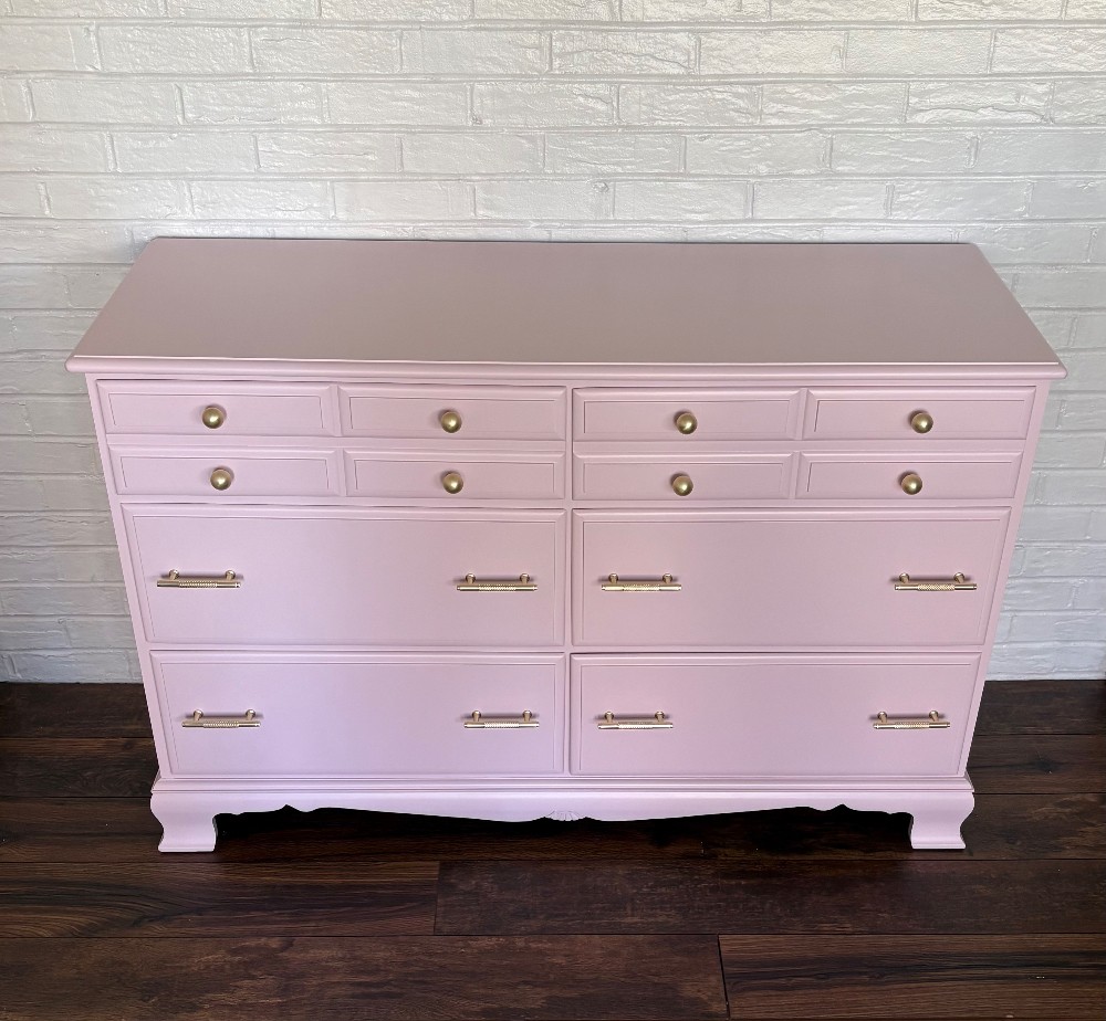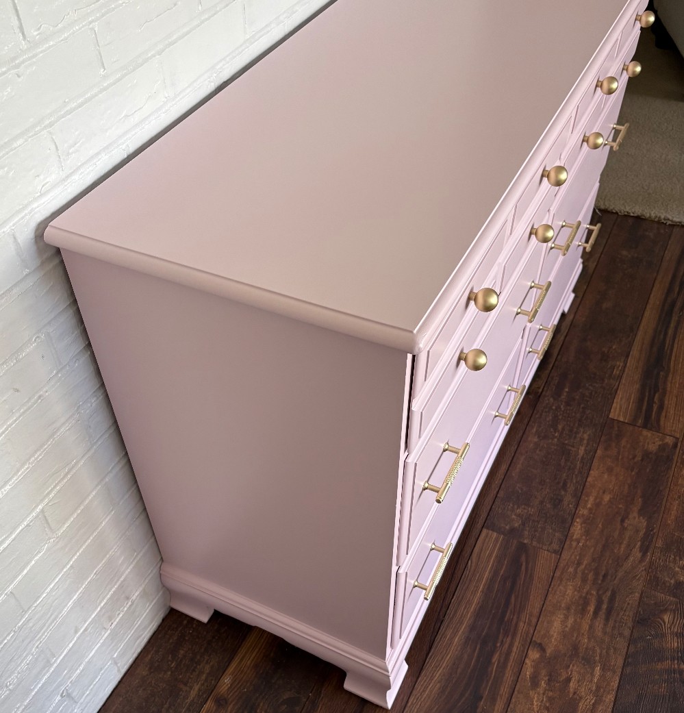 Oh so pretty 🤩 This Dresser has been sanded, primed (in Stix) & painted in Benjamin Moore Advance Satin. Color is pink. Easy glide drawers & very clean. Comes with touch up paint.