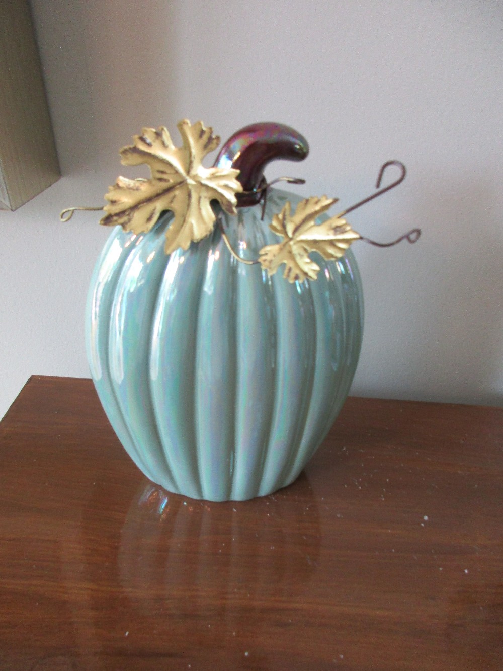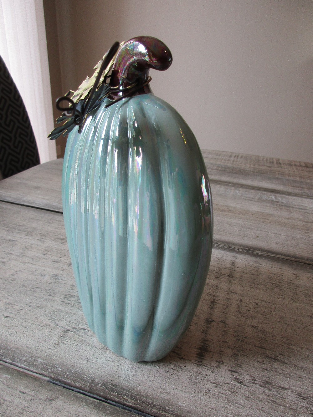 Ceramic Pumpkins with Metal Leaves - Narrow fits anywhereiridescent Colors Light Green9-1/2 x 7
