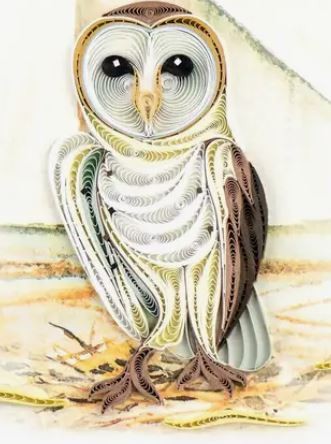 Barn Owls remind us that there is more within us than we know and we are capable of overcoming anything. The card design features a white, brown and cream quilled owl. The owl is perched in some water-colored hay on the floor of a barn.