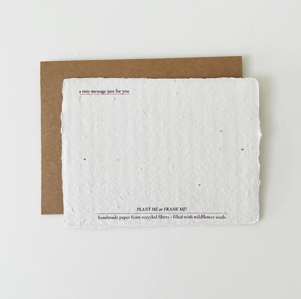 Tiny Poetry Project notecards are a gift to be meditated upon, shared, and then planted or framed. The paper is handmade by local artisans and embedded with wildflower seeds. The envelopes are 100% recycled and the clear sleeves are plant based and compostable. Tiny poetry project cards are kind to our hearts and to the environment.