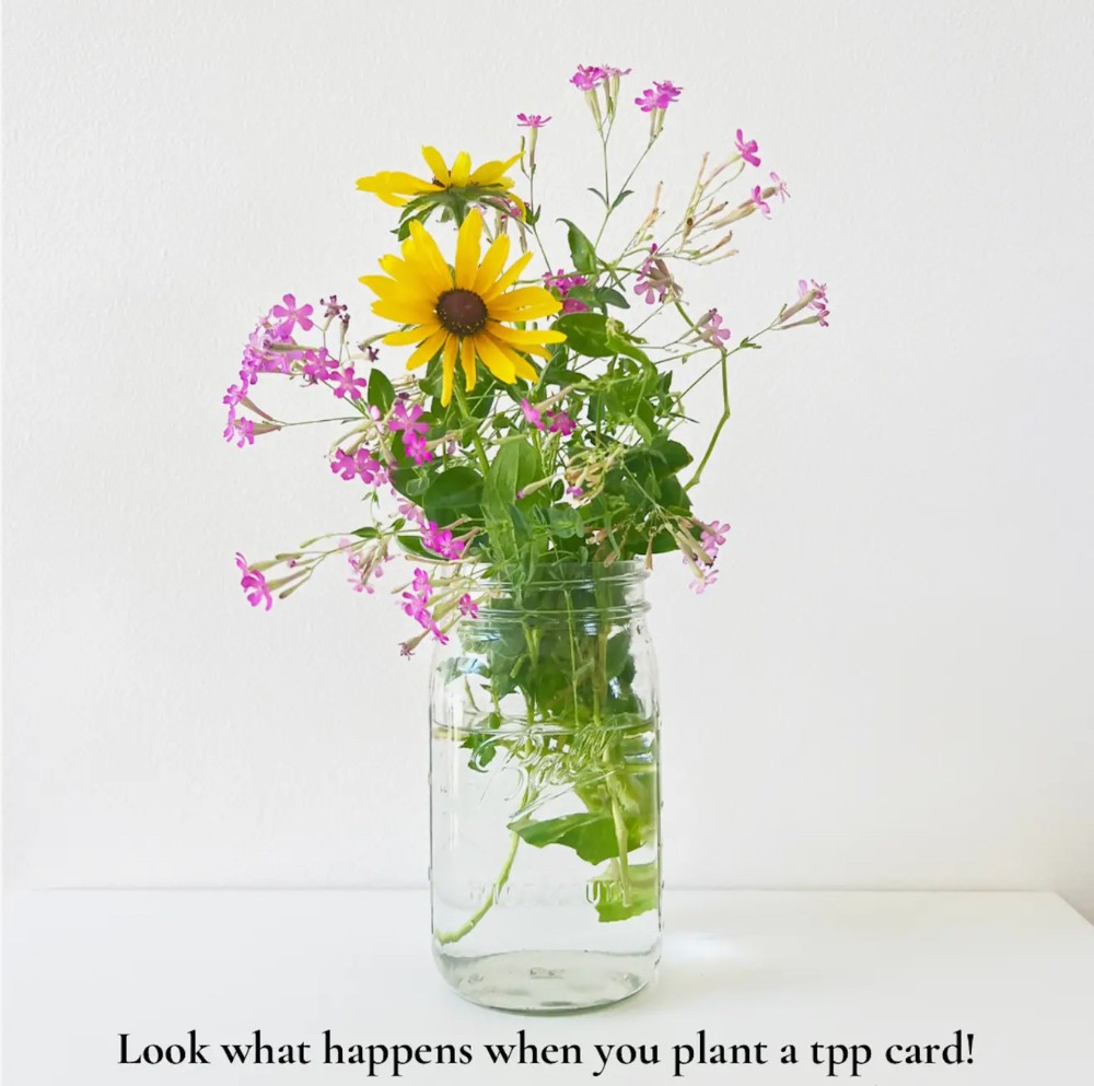 Tiny Poetry Project notecards are a gift to be meditated upon, shared, and then planted or framed. The paper is handmade by local artisans and embedded with wildflower seeds. The envelopes are 100% recycled and the clear sleeves are plant based and compostable. Tiny poetry project cards are kind to our hearts and to the environment.