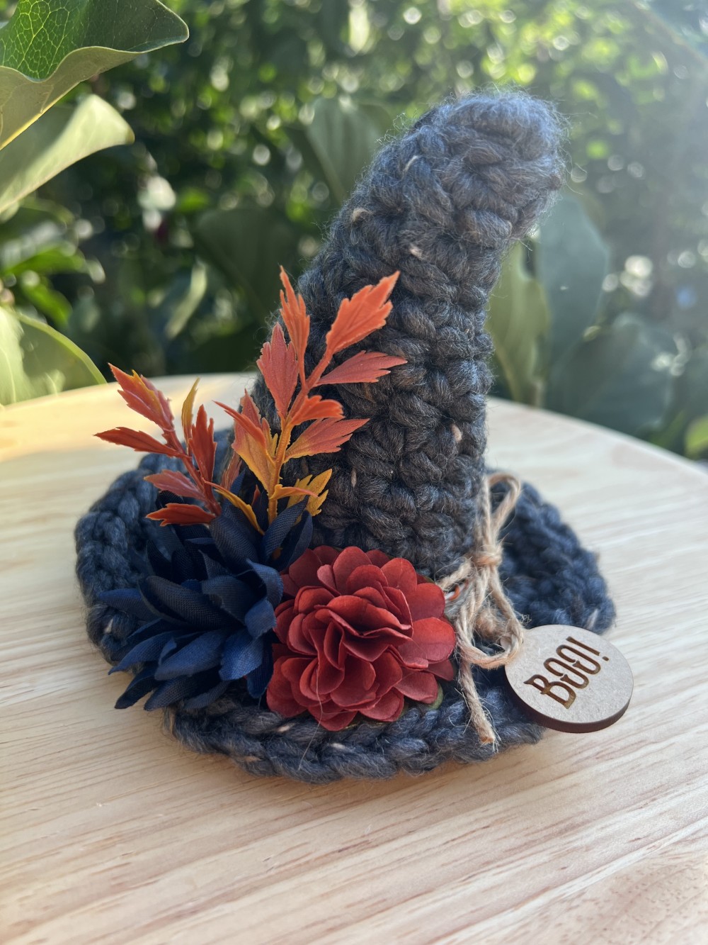 Handmade crochet witch hat with faux floral decorations and wood “Boo” tag.