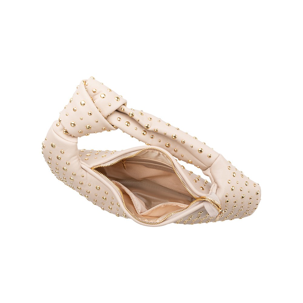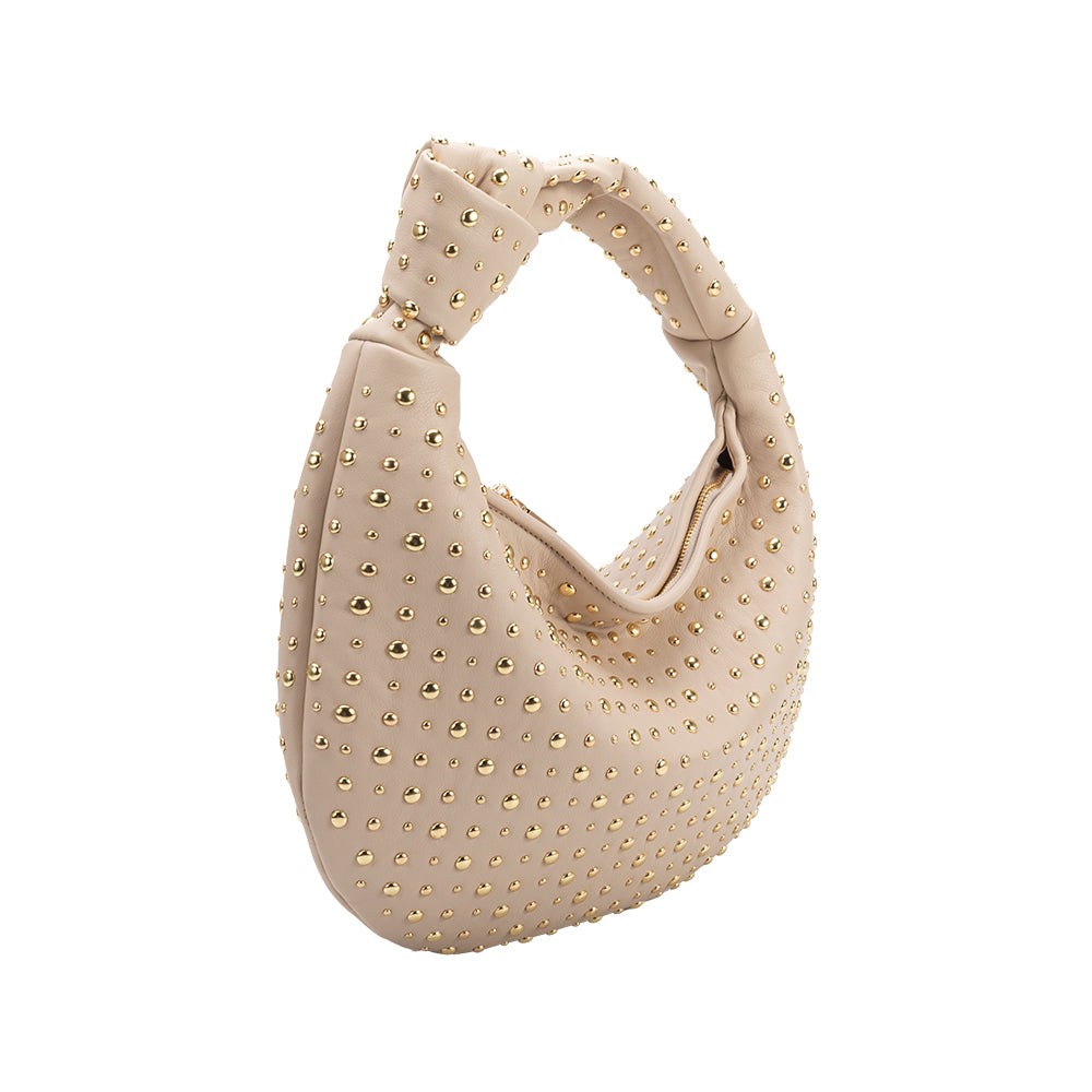 A favorite bag, Brigitte, now with a studded design. The spacious interior allows all your essentials to fit nicely, and the pockets help keep your belongings organized. Features interior zip and slot pockets.