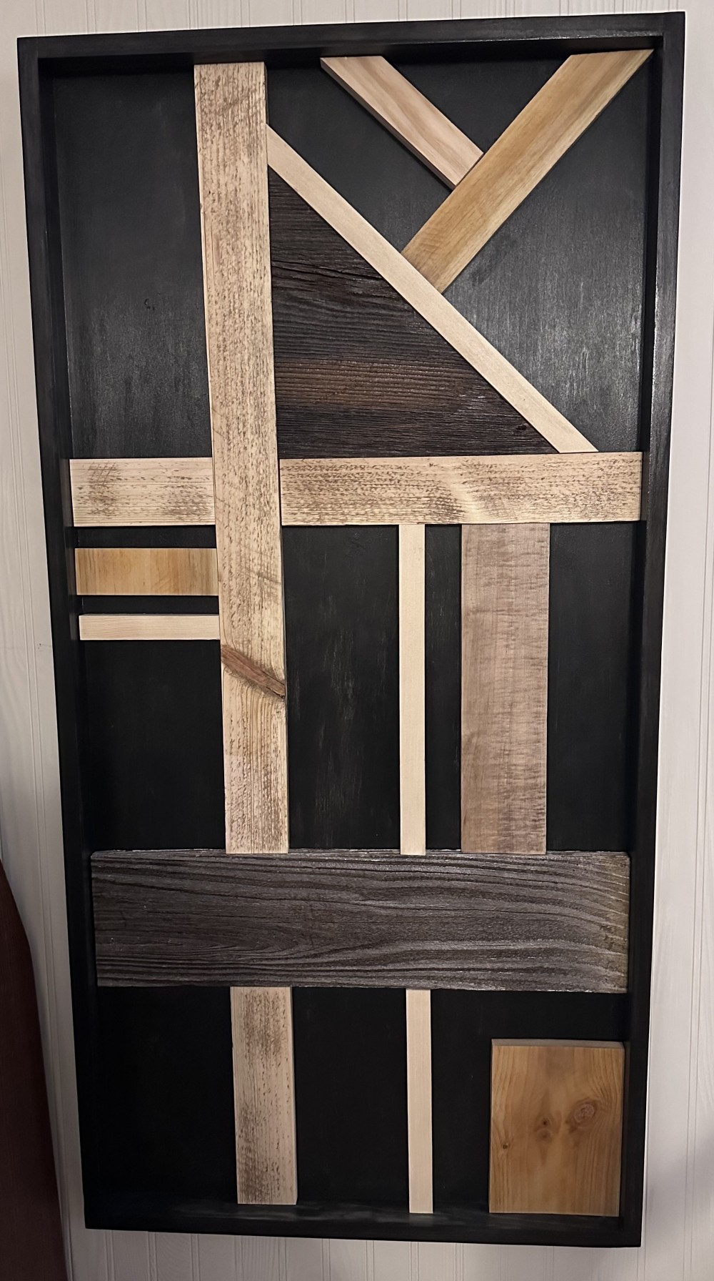 We created this 24 x 48 frame, stained it black, and added reclaimed wood to create the design. It was varnished and wire hangers were added to allow you to hang it in two different ways. (see pictures for hanging choices)