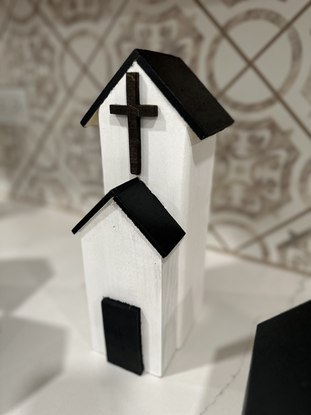 This church is handcrafted so each one is unique. A varnish topcoat has been added to all painted and stained surfaces.