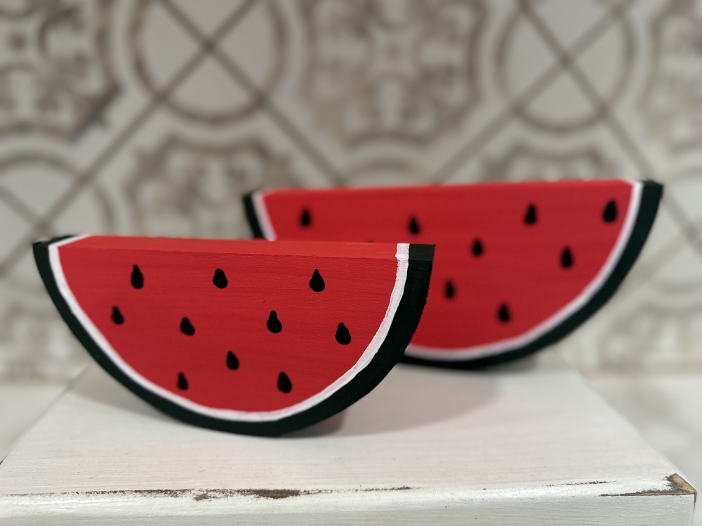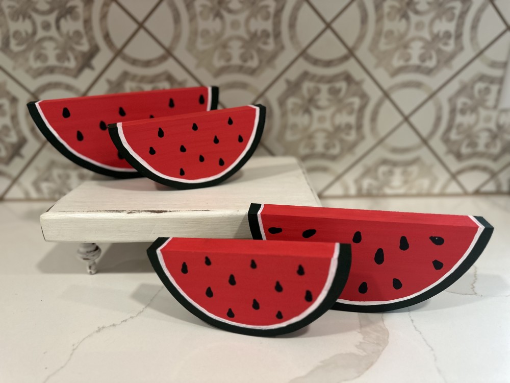 We created this wooden watermelon to help you decorate for summer. Since they are made by hand, each one is unique and no two are exactly alike. Happy Summer!