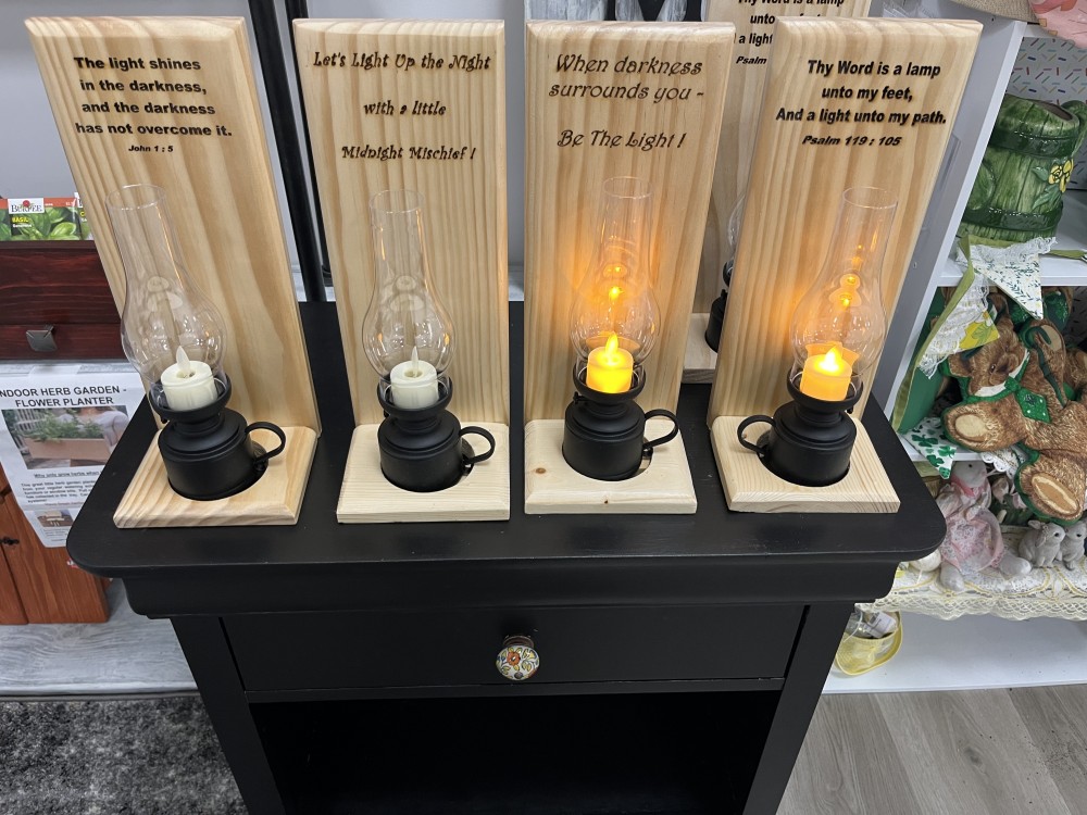 Personalized wooden wall mount or free standing antique oil lamp with light that flickers which is battery operated