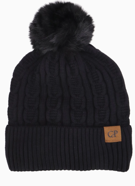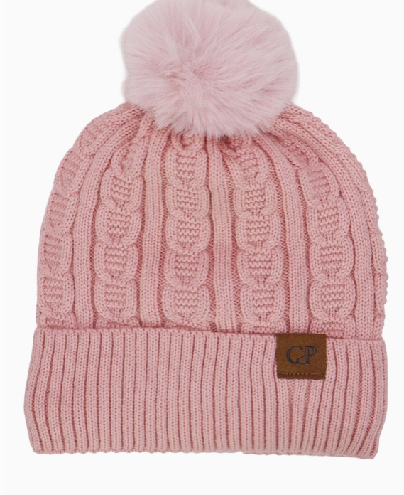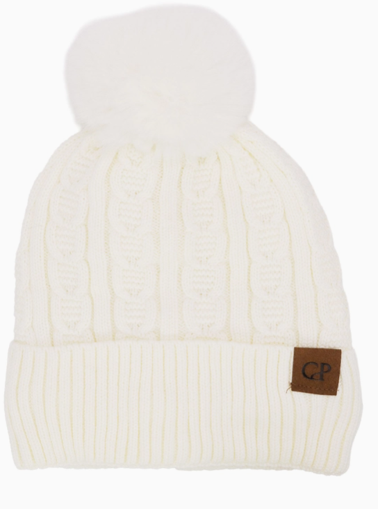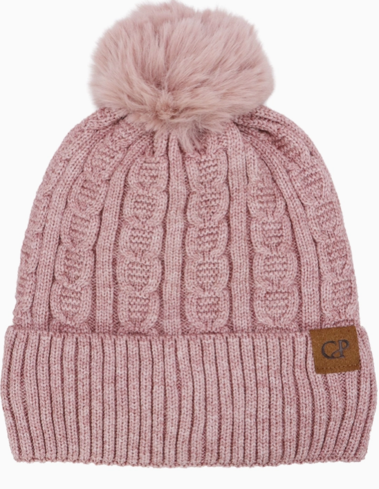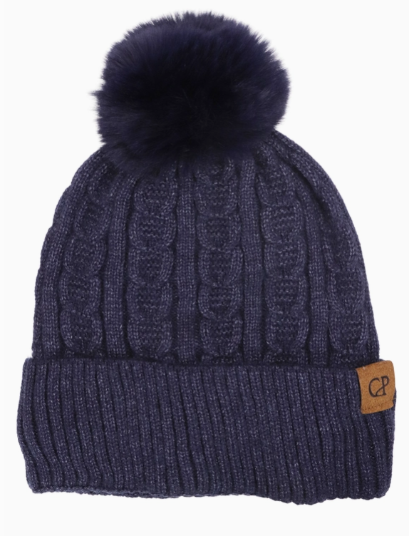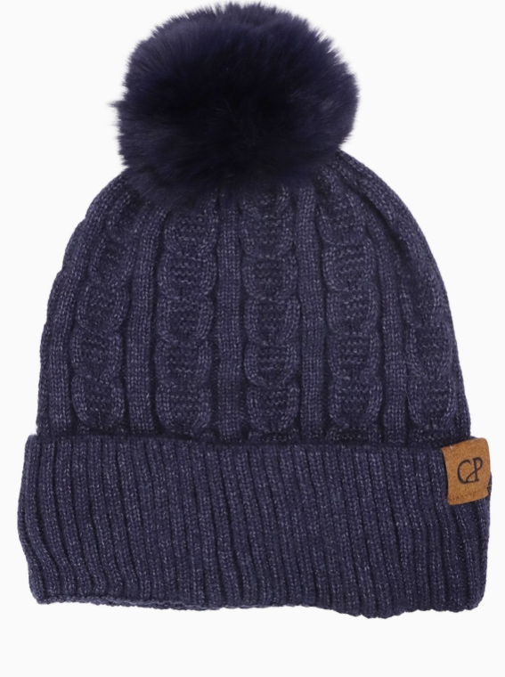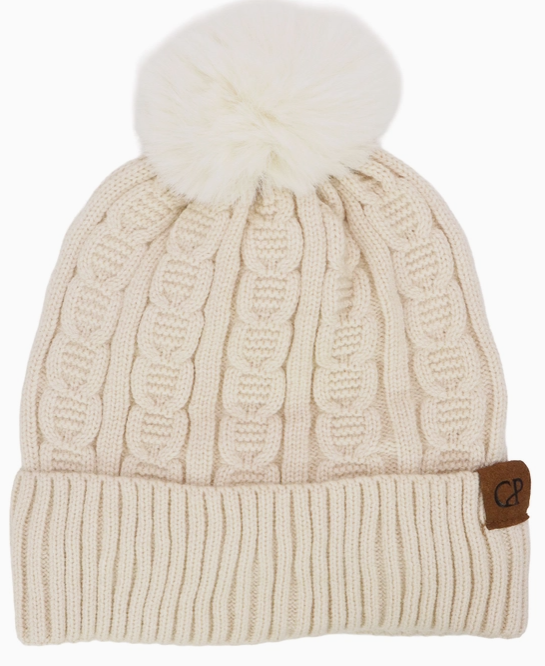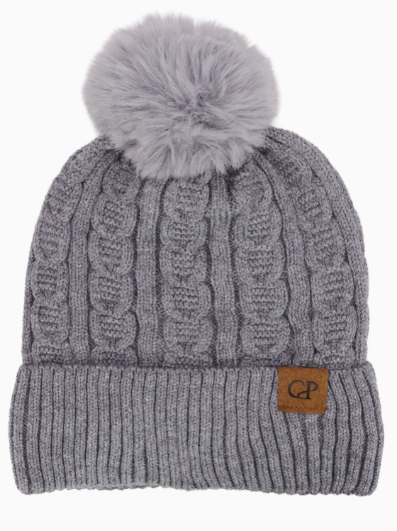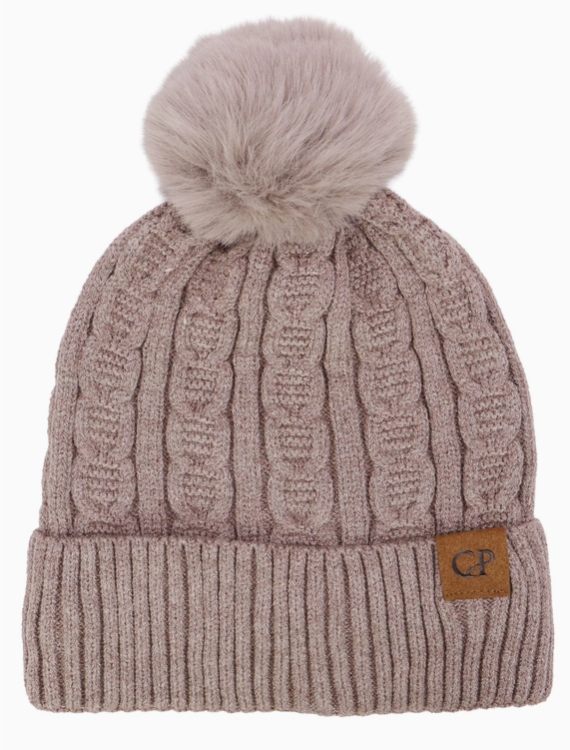 Heathered Cable Yarn Knitted Sherpa Fleece Lined Fluffy Faux Fur Pom Pom Cuffed Trooper Beanie100% Polyester