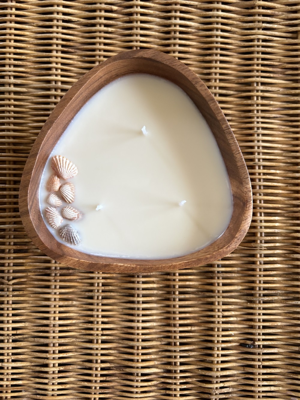 This candle was created by Three Rooker Collections. They used a unique vessel filled with 100% soy wax and coconut, sandalwood, and amber essential oils. The seashells included were brought from Three Rooker Island in Florida!