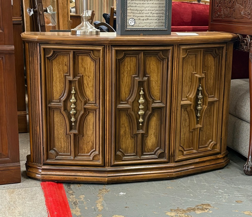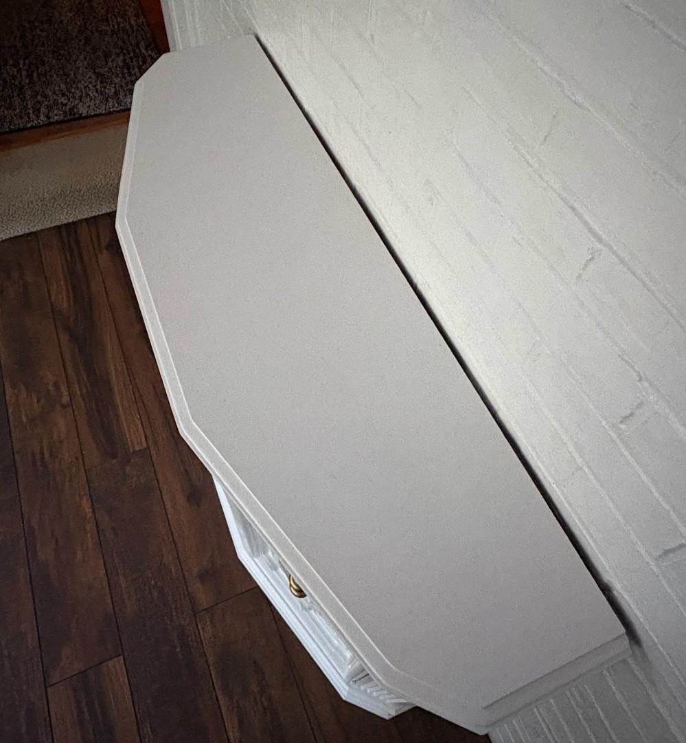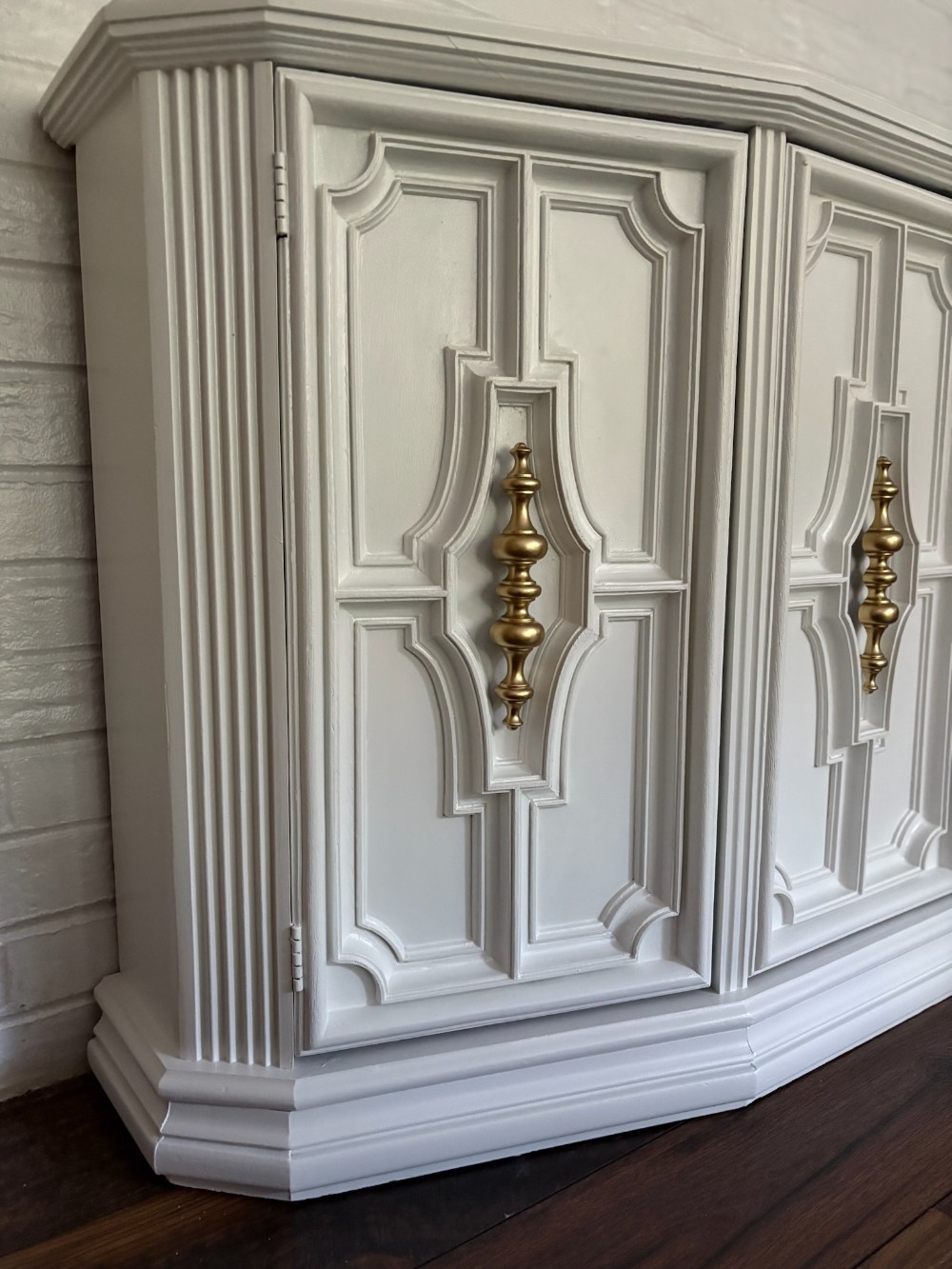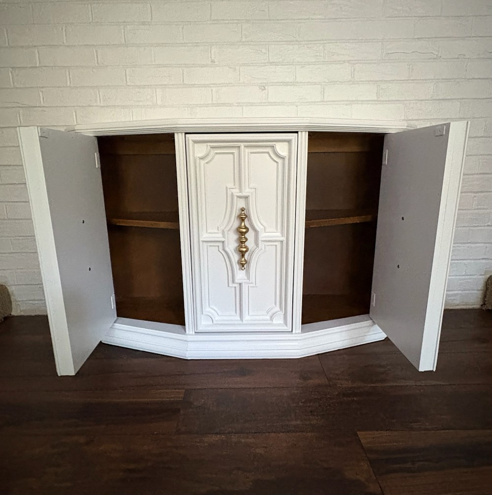 Super cool Vintage Console. It’s been finished with Benjamin Moore Advance Satin in a crisp white called White Heron. Measures 46x30x14 deep. Inside is clean & unpainted. See before pic to truly appreciate this transformation 😍