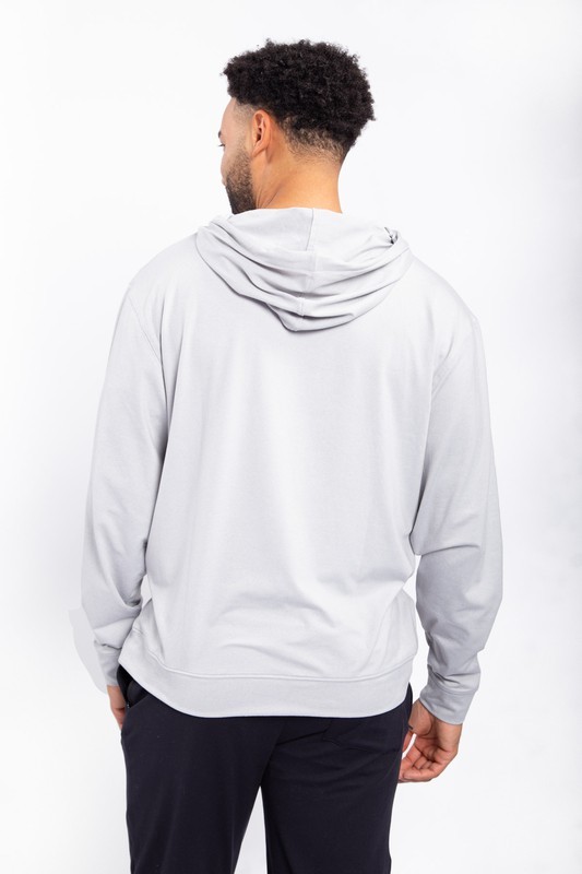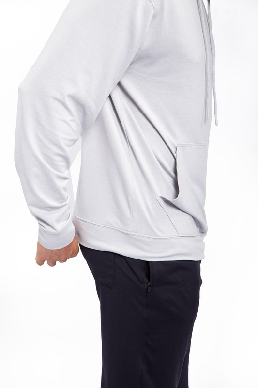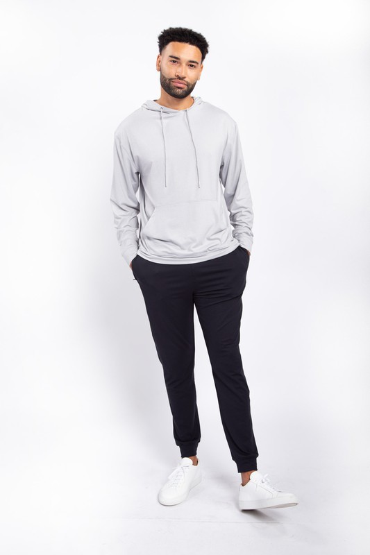 This day to day hoodie has a classic silhouette and features drawstrings and a kangaroo pocket / Moisture-wicking, four-way stretch / 53% nylon, 38% polyester, 9% lycra