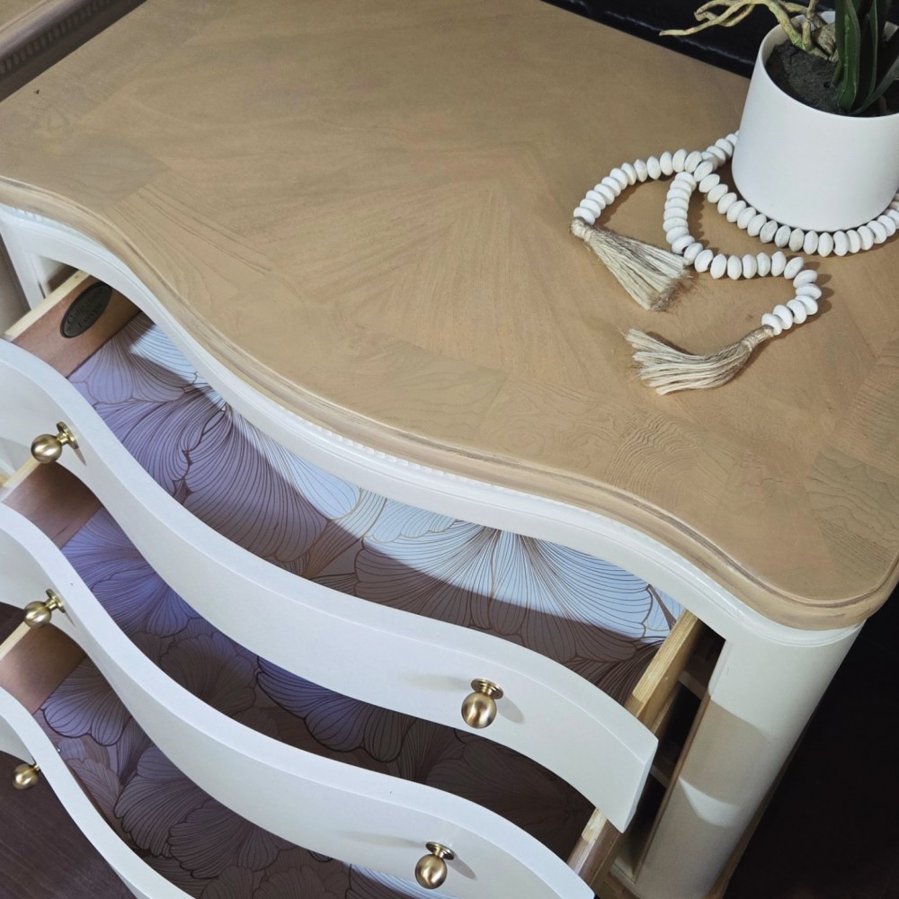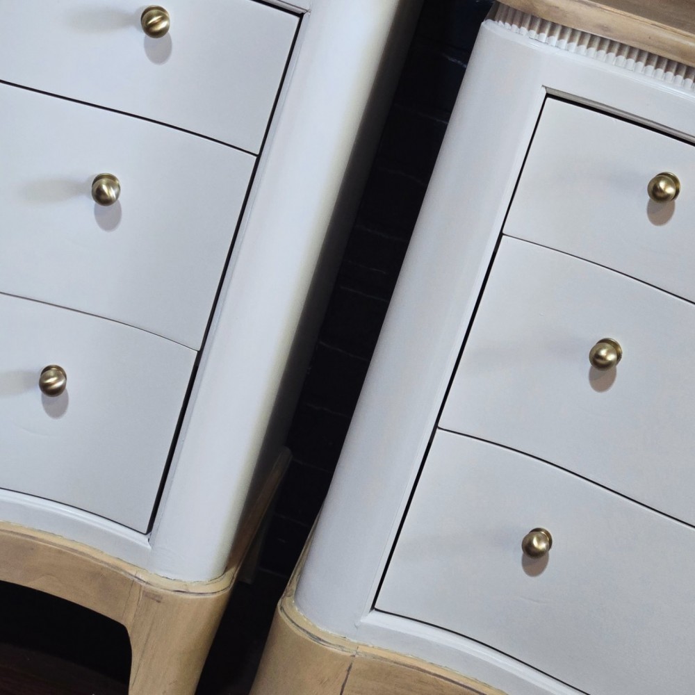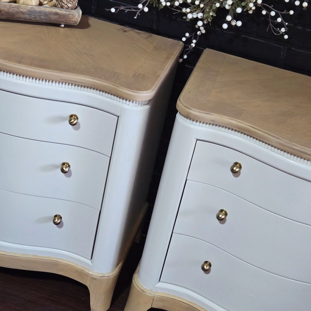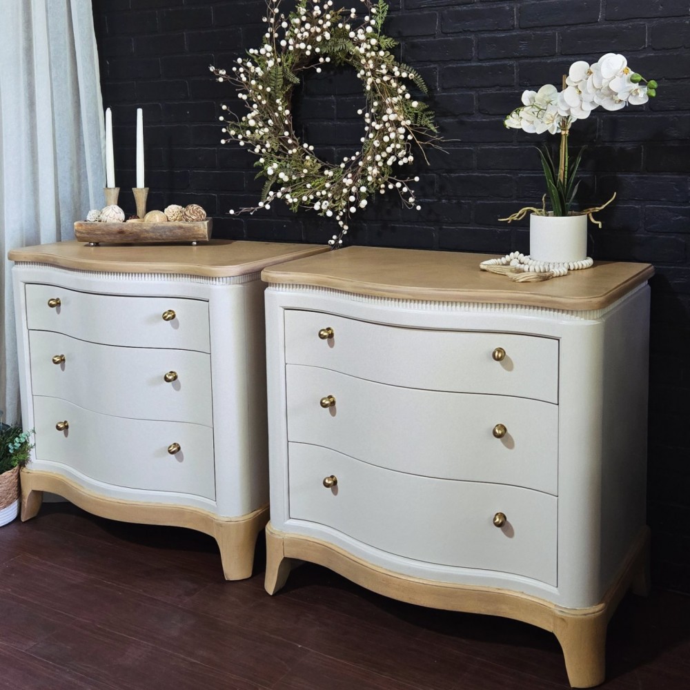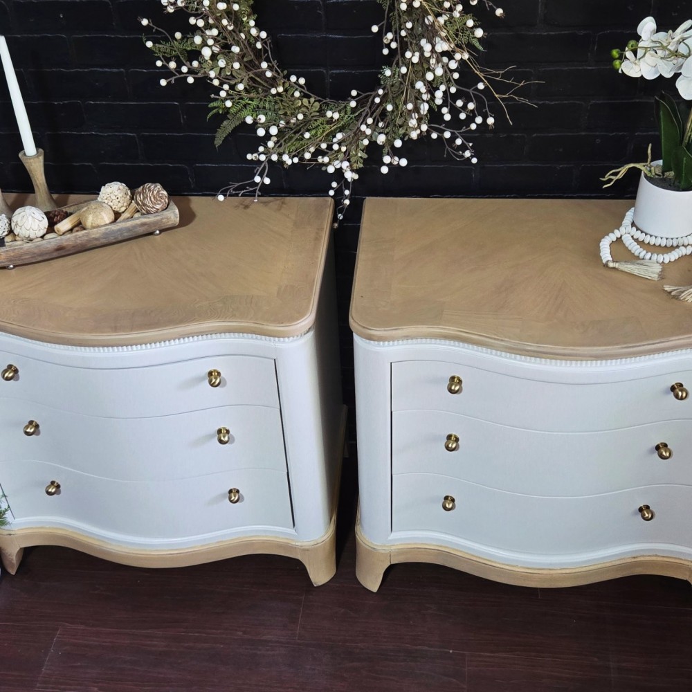 XXL set od nightstands. Top and base completely sanded and paint washed in Lilly Moon Paint #rattan. Then ##woodenbarrel gel stain applied over it. Rest painted in fusionmineralpaint cashmere. Sealed in satin poly for durability and protection. All drawers in excellent working condition and fully lined. New hardware.