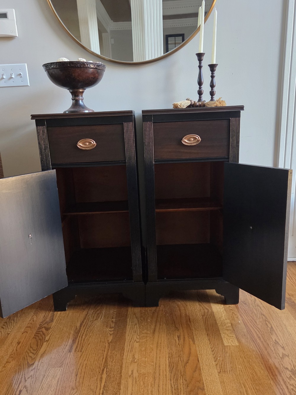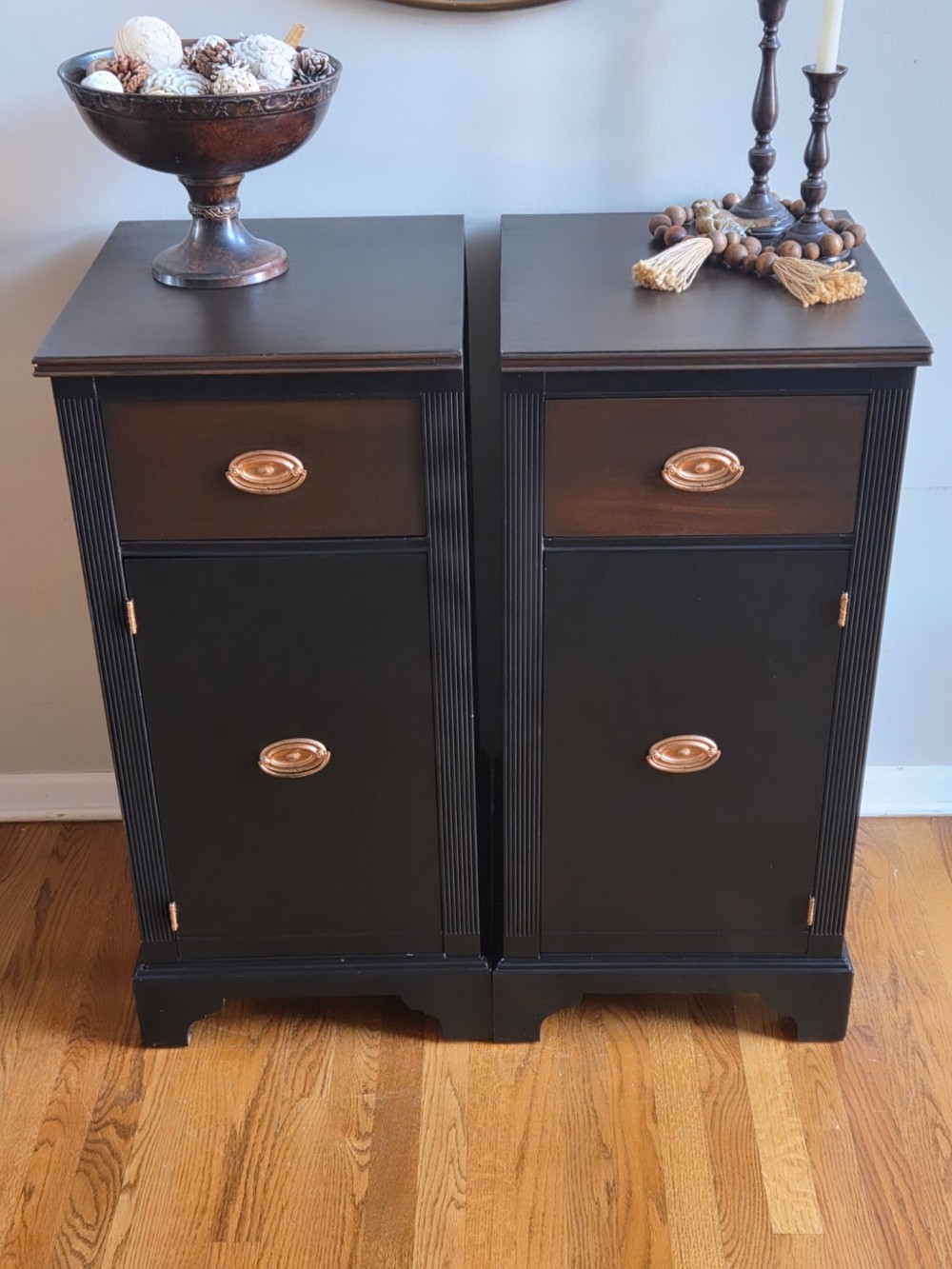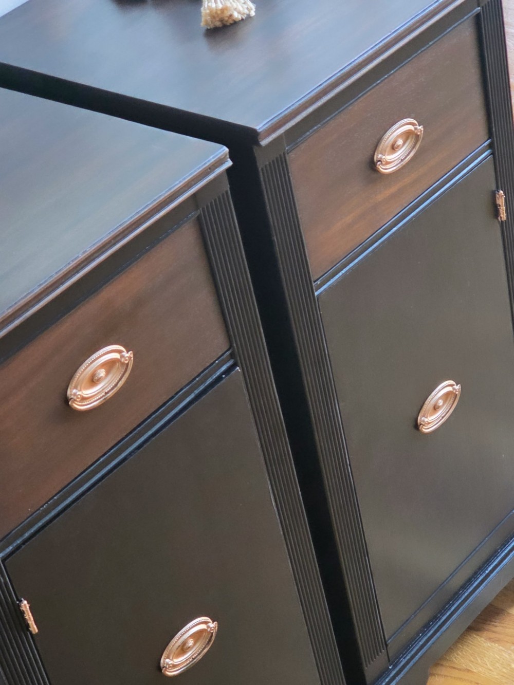 Tops and drawers sanded completely and stained in Varathane #kona. Rest scuffed and painted in Fusion Mineral Paint #coalblack. Sealed in satin poly for durability and protection. Drawers lined. Original hardware cleaned and polished.